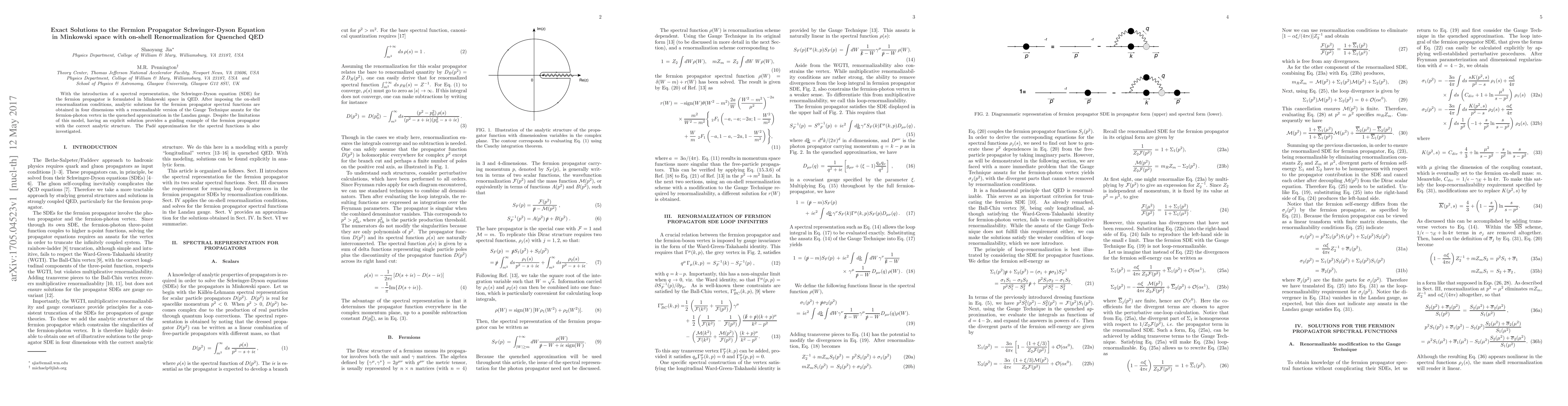This paper presents exact solutions to the Schwinger-Dyson equation for the fermion propagator in Minkowski space using on-shell renormalization within quenched QED. The study employs a spectral representation and a renormalizable Gauge Technique anzatz, yielding analytic solutions in four dimensions, despite model limitations.