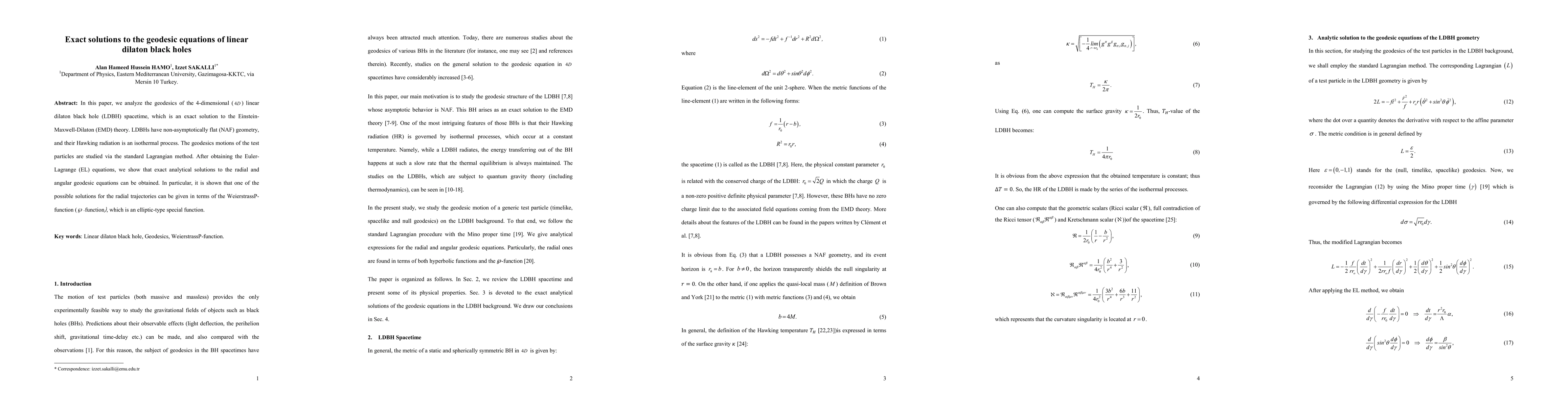 This paper investigates the geodesics of 4D linear dilaton black holes (LDBH) within the Einstein-Maxwell-Dilaton theory, deriving exact analytical solutions for radial and angular geodesic equations. Notably, one radial trajectory solution is expressed in terms of the Weierstrass $\wp$-function, an elliptic special function.