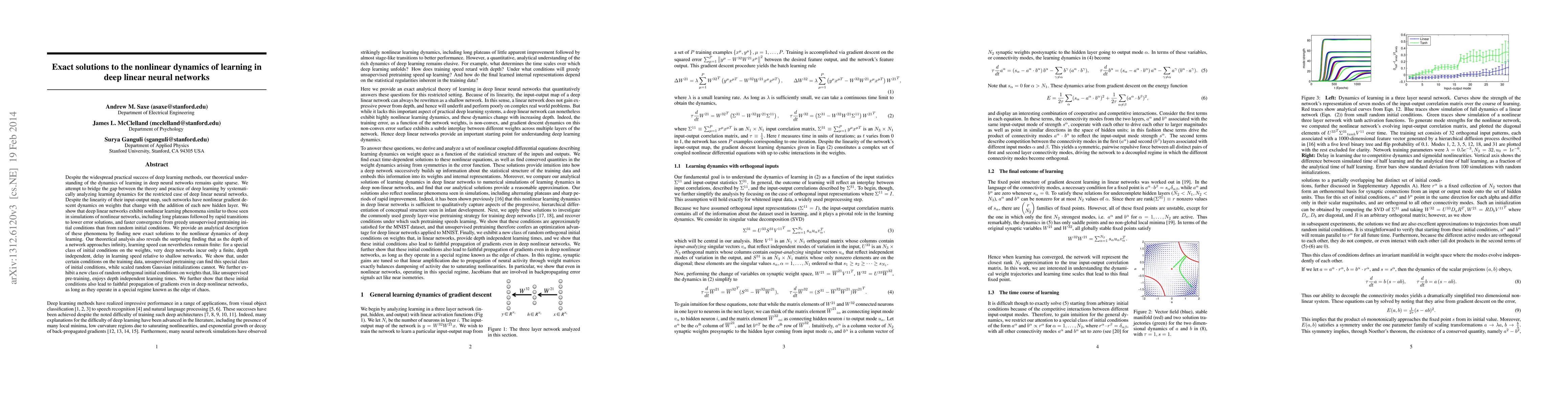 This paper provides exact solutions to the nonlinear dynamics of learning in deep linear neural networks, revealing phenomena similar to those in nonlinear networks, such as long plateaus and rapid transitions. It shows that very deep networks can maintain finite learning speed under specific initial conditions, and identifies unsupervised pretraining as a method to achieve these conditions.