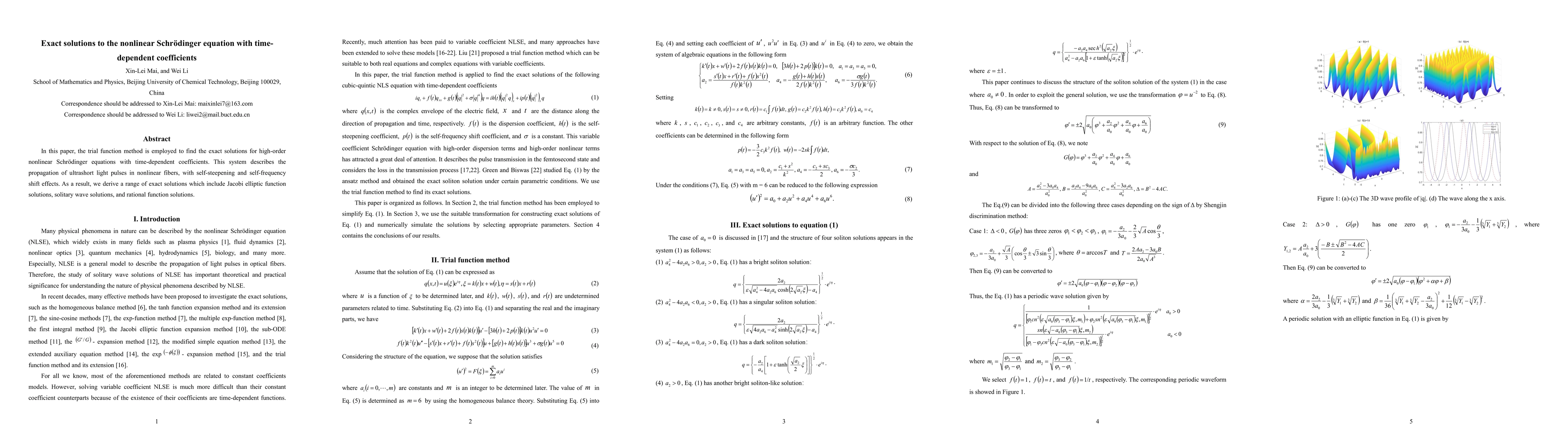 This paper uses the trial function method to derive exact solutions for high-order nonlinear Schrödinger equations with time-dependent coefficients, describing ultrashort light pulse propagation in nonlinear fibers, including Jacobi elliptic, solitary wave, and rational function solutions.