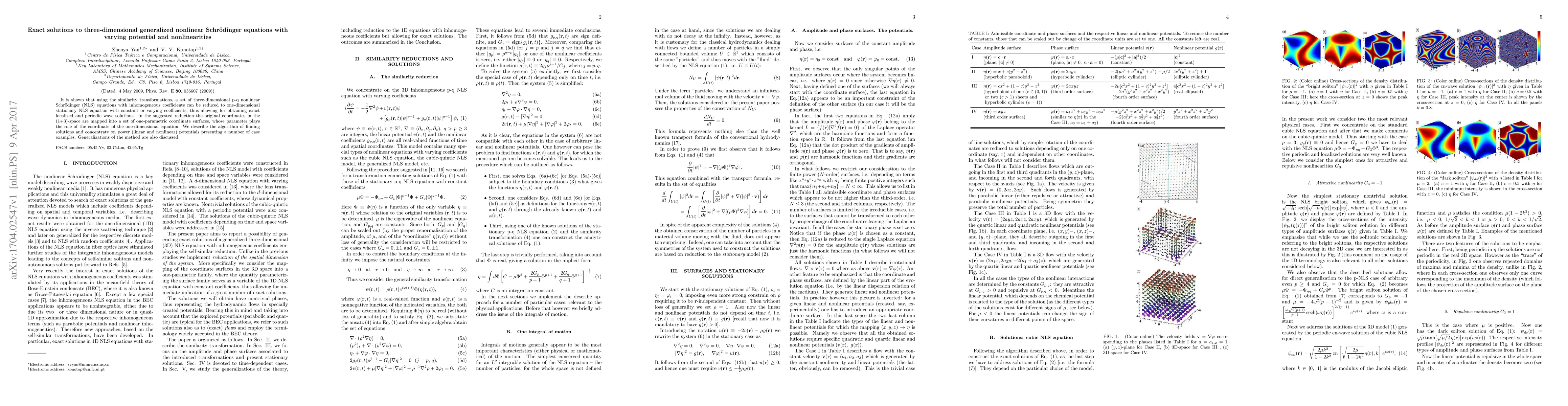 This paper demonstrates how similarity transformations reduce three-dimensional generalized nonlinear Schrödinger equations with varying potentials to one-dimensional forms, enabling the derivation of exact localized and periodic wave solutions. The method maps original coordinates into one-parametric surfaces, and the paper provides an algorithm for finding solutions, with examples focusing on power potentials.