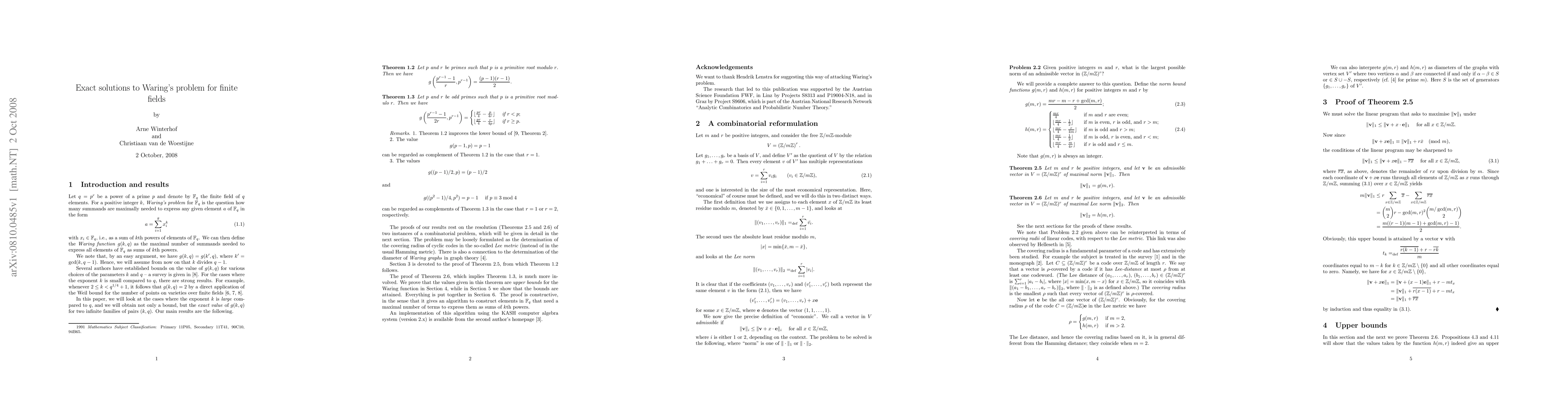The Waring function $g(k,q)$ measures the difficulty of Waring's problem for $k$th powers in the field of $q$ elements. Its calculation seems to be difficult, and many partial results have been published, notably upper bounds for certain regions of the $k$-$q$-plane. In this paper, we compute the exact value of $g(k,q)$ for two infinite families of exponent-field pairs. In these, $k$ is large compared to $q$. We use a new method of proof that is mainly combinatorial in nature.