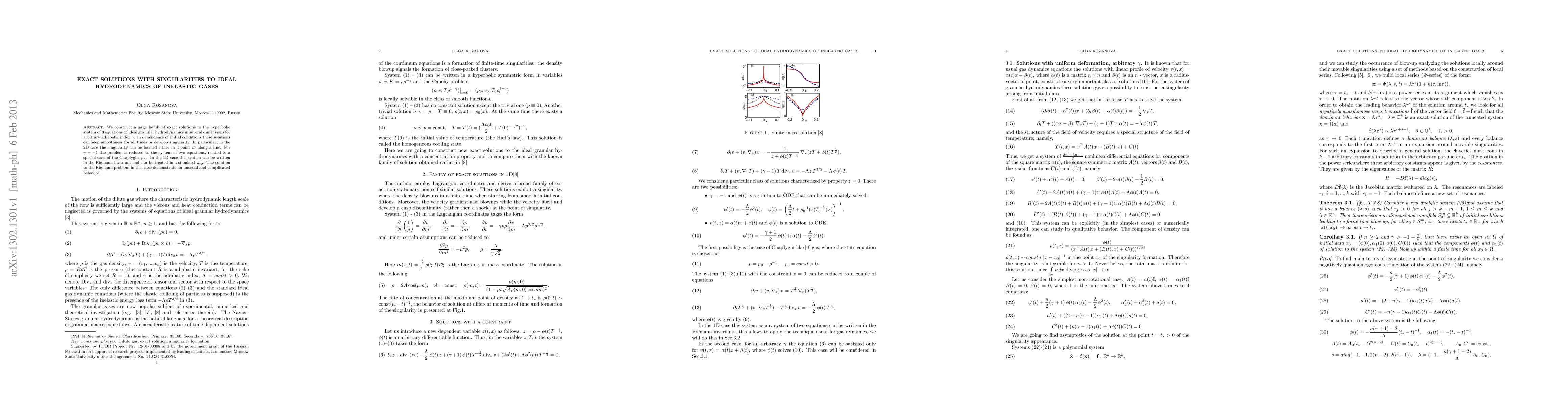 We construct a large family of exact solutions to the hyperbolic system of 3 equations of ideal granular hydrodynamics in several dimensions for arbitrary adiabatic index $\gamma$. In dependence of initial conditions these solutions can keep smoothness for all times or develop singularity. In particular, in the 2D case the singularity can be formed either in a point or along a line. For $\gamma=-1$ the problem is reduced to the system of two equations, related to a special case of the Chaplygin gas. In the 1D case this system can be written in the Riemann invariant and can be treated in a standard way. The solution to the Riemann problem in this case demonstrate an unusual and complicated behavior.