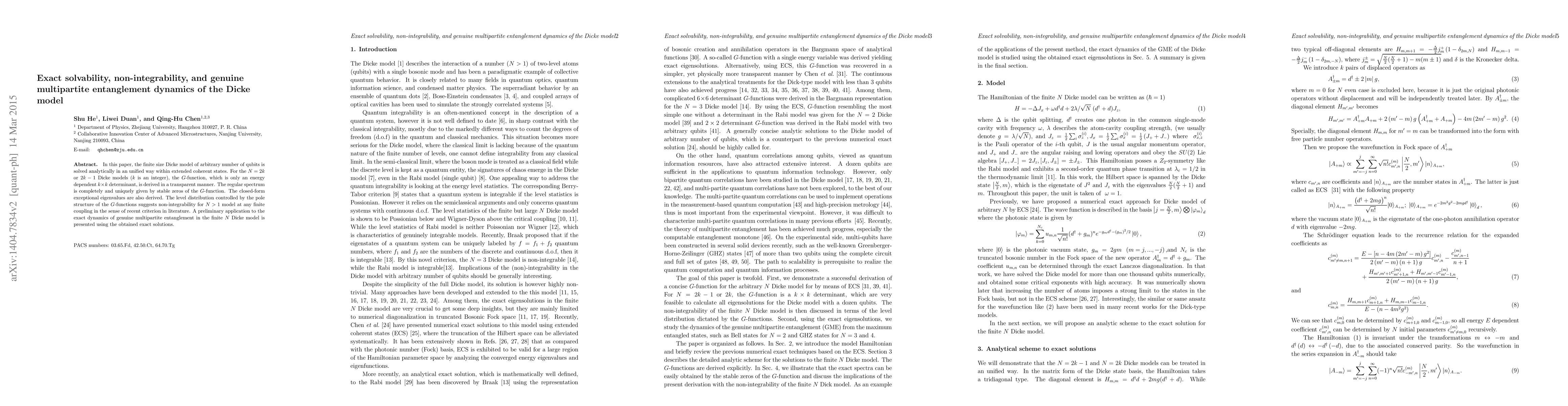 This paper analytically solves the finite size Dicke model for any number of qubits using extended coherent states, deriving a $G$-function determinant for the energy spectrum. It demonstrates non-integrability for models with $N>1$ and explores the dynamics of genuine multipartite entanglement using the obtained exact solutions.