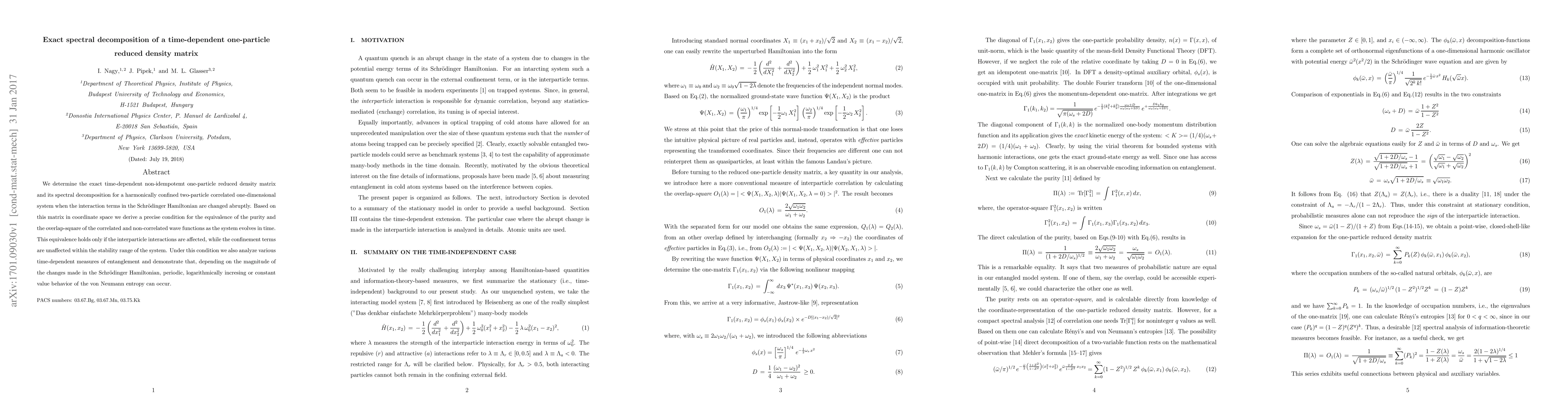 We determine the exact time-dependent non-idempotent one-particle reduced density matrix and its spectral decomposition for a harmonically confined two-particle correlated one-dimensional system when the interaction terms in the Schr\"odinger Hamiltonian are changed abruptly. Based on this matrix in coordinate space we derivea precise condition for the equivalence of the purity and the overlap-square of the correlated and non-correlated wave functions as the system evolves in time. This equivalence holds only if the interparticle interactions are affected, while the confinement terms are unaffected within the stability range of the system. Under this condition we also analyze various time-dependent measures of entanglement and demonstrate that, depending on the magnitude of the changes made in the Schr\"odinger Hamiltonian, periodic, logarithmically incresing or constant value behavior of the von Neumann entropy can occur.