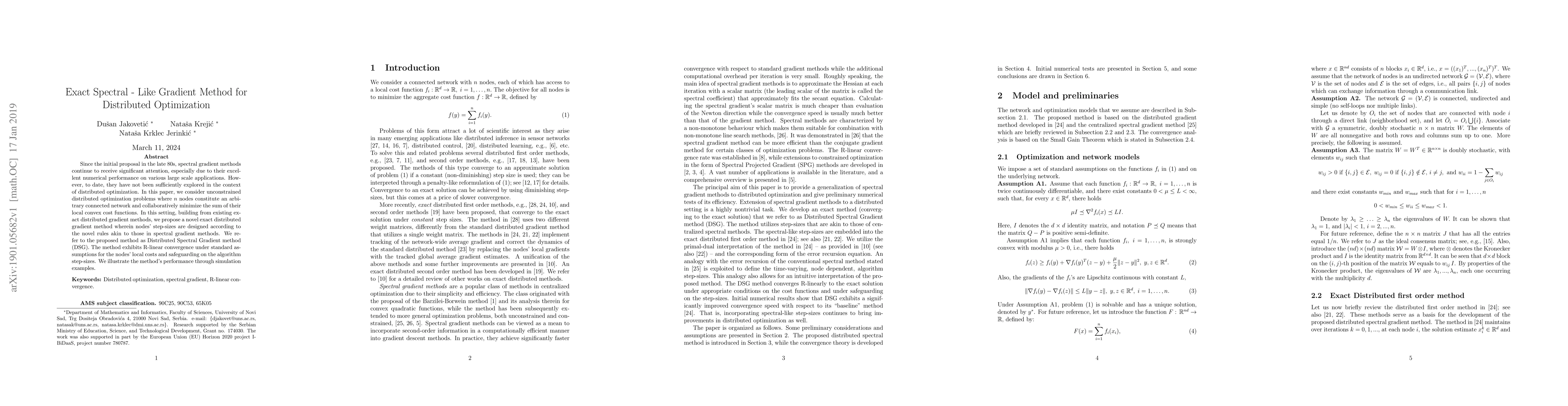 Since the initial proposal in the late 80s, spectral gradient methods continue to receive significant attention, especially due to their excellent numerical performance on various large scale applications. However, to date, they have not been sufficiently explored in the context of distributed optimization. In this paper, we consider unconstrained distributed optimization problems where $n$ nodes constitute an arbitrary connected network and collaboratively minimize the sum of their local convex cost functions. In this setting, building from existing exact distributed gradient methods, we propose a novel exact distributed gradient method wherein nodes' step-sizes are designed according to the novel rules akin to those in spectral gradient methods. We refer to the proposed method as Distributed Spectral Gradient method (DSG). The method exhibits R-linear convergence under standard assumptions for the nodes' local costs and safeguarding on the algorithm step-sizes. We illustrate the method's performance through simulation examples.