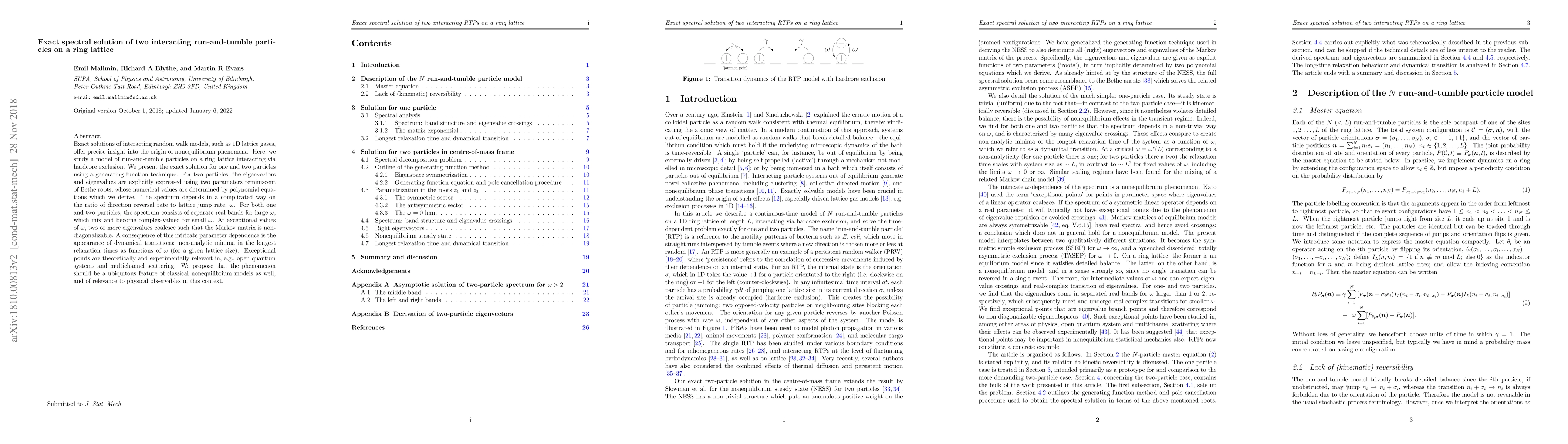 Exact solutions of interacting random walk models, such as 1D lattice gases, offer precise insight into the origin of nonequilibrium phenomena. Here, we study a model of run-and-tumble particles on a ring lattice interacting via hardcore exclusion. We present the exact solution for one and two particles using a generating function technique. For two particles, the eigenvectors and eigenvalues are explicitly expressed using two parameters reminiscent of Bethe roots, whose numerical values are determined by polynomial equations which we derive. The spectrum depends in a complicated way on the ratio of direction reversal rate to lattice jump rate, $\omega$. For both one and two particles, the spectrum consists of separate real bands for large $\omega$, which mix and become complex-valued for small $\omega$. At exceptional values of $\omega$, two or more eigenvalues coalesce such that the Markov matrix is non-diagonalizable. A consequence of this intricate parameter dependence is the appearance of dynamical transitions: non-analytic minima in the longest relaxation times as functions of $\omega$ (for a given lattice size). Exceptional points are theoretically and experimentally relevant in, e.g., open quantum systems and multichannel scattering. We propose that the phenomenon should be a ubiquitous feature of classical nonequilibrium models as well, and of relevance to physical observables in this context.
