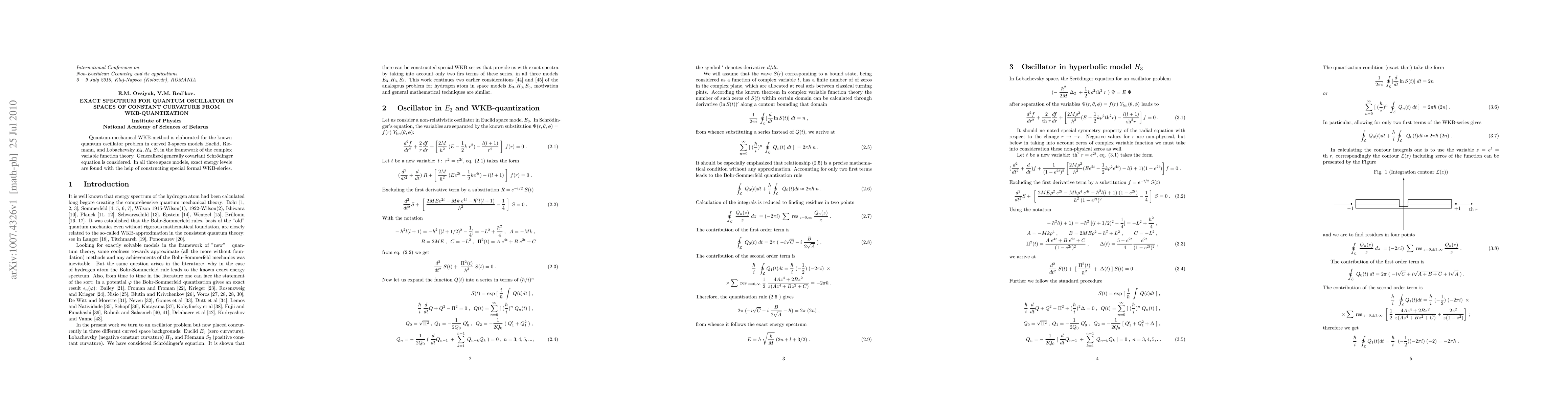 Quantum-mechanical WKB-method is elaborated for the known quantum oscillator problem in curved 3-spaces models Euclid, Riemann, and Lobachevsky E_{3}, H_{3}, S_{3} in the framework of the complex variable function theory. Generalized generally covariant Schr\"{o}dinger equation is considered. In all three space models, exact energy levels are found with the help of constructing special formal WKB-sieries.