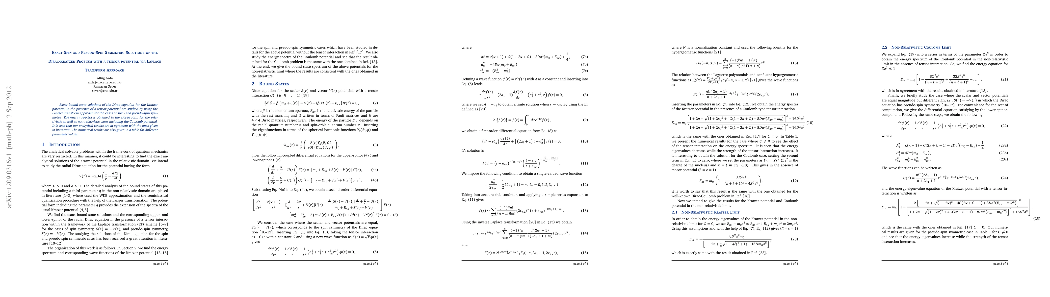 This paper presents exact bound state solutions for the Dirac equation under the Kratzer potential with a tensor potential, utilizing the Laplace transform approach. The study achieves closed-form energy spectra for both relativistic and non-relativistic scenarios, including the Coulomb potential, and confirms the analytical results with existing literature.