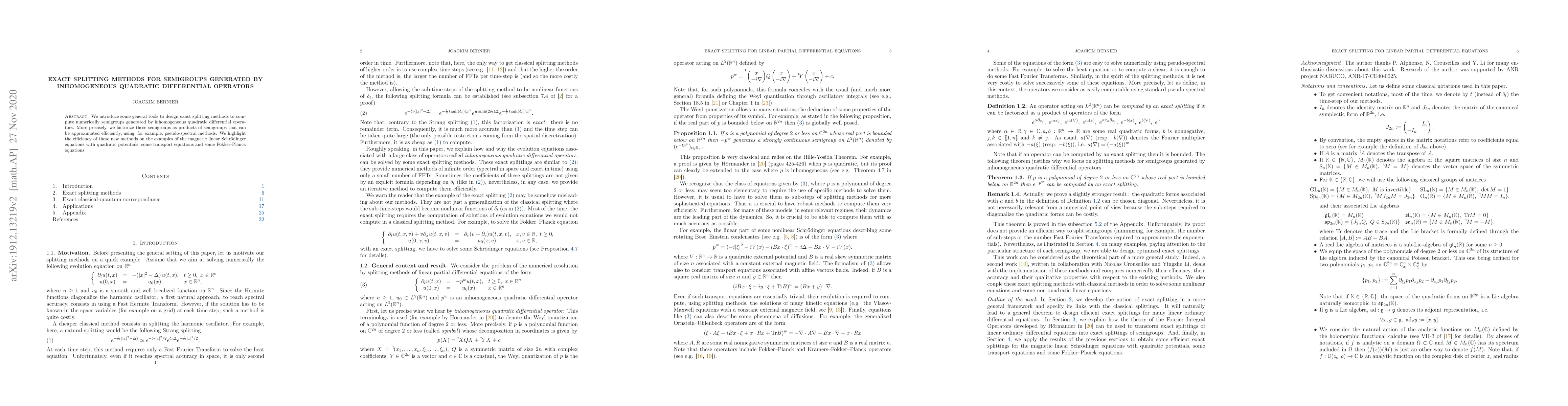 This paper introduces exact splitting methods for numerically computing semigroups generated by inhomogeneous quadratic differential operators, factorizing them into efficiently approximable components, and demonstrates their efficiency on magnetic Schrödinger, transport, and Fokker-Planck equations.