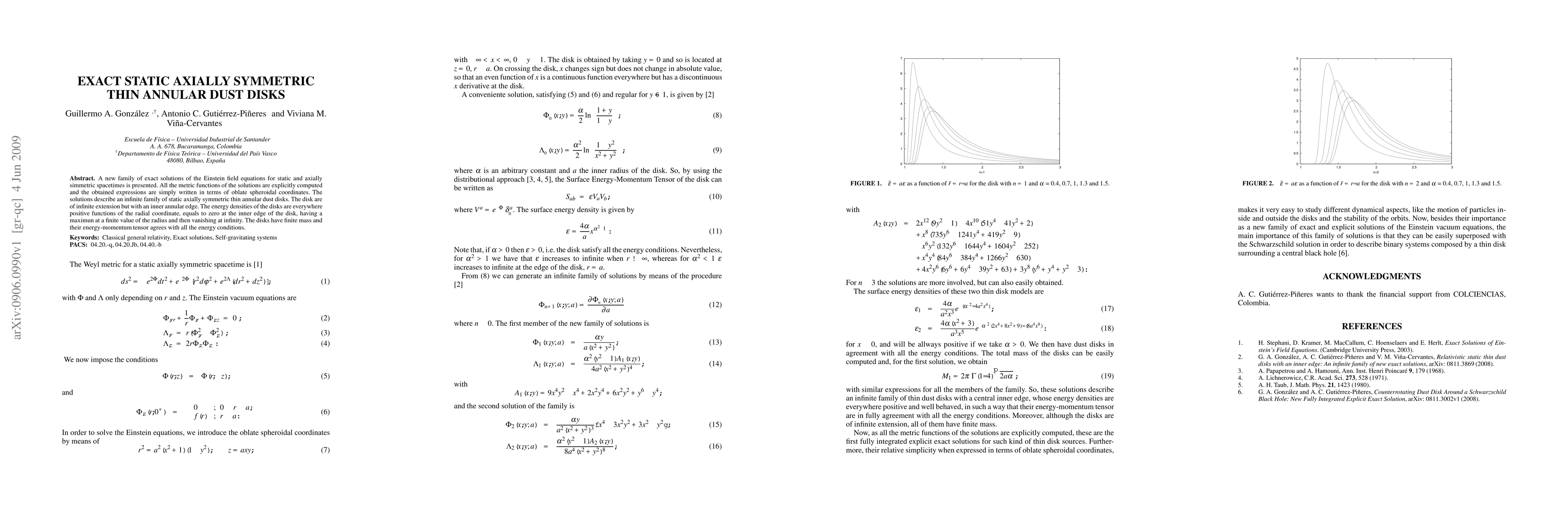This paper presents exact solutions of the Einstein field equations for static, axially symmetric spacetimes describing infinite, thin annular dust disks with positive energy density peaking at a finite radius and vanishing at the inner edge and infinity, consistent with energy conditions. The solutions are expressed in oblate spheroidal coordinates.