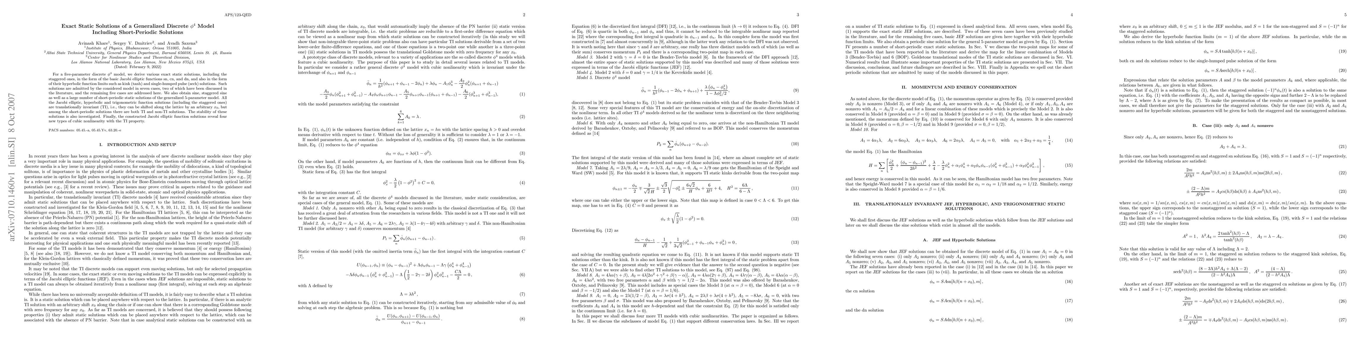 This paper explores exact static solutions for a five-parameter discrete $\phi^4$ model, deriving solutions including Jacobi elliptic functions and their hyperbolic limits. It identifies seven cases admitting such solutions, five of which are new, and investigates the stability and translational invariance of these solutions.