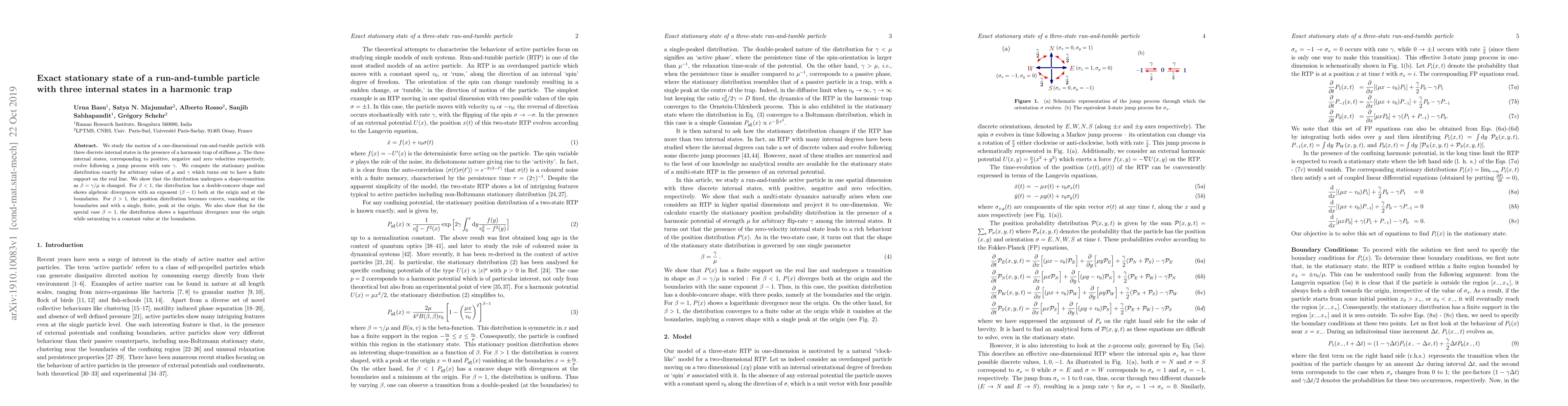 This paper investigates the stationary state of a run-and-tumble particle with three internal states in a harmonic trap, deriving an exact position distribution for arbitrary parameters. The distribution exhibits a shape transition with a double-concave form for lower rates and a convex form with a peak at the origin for higher rates.