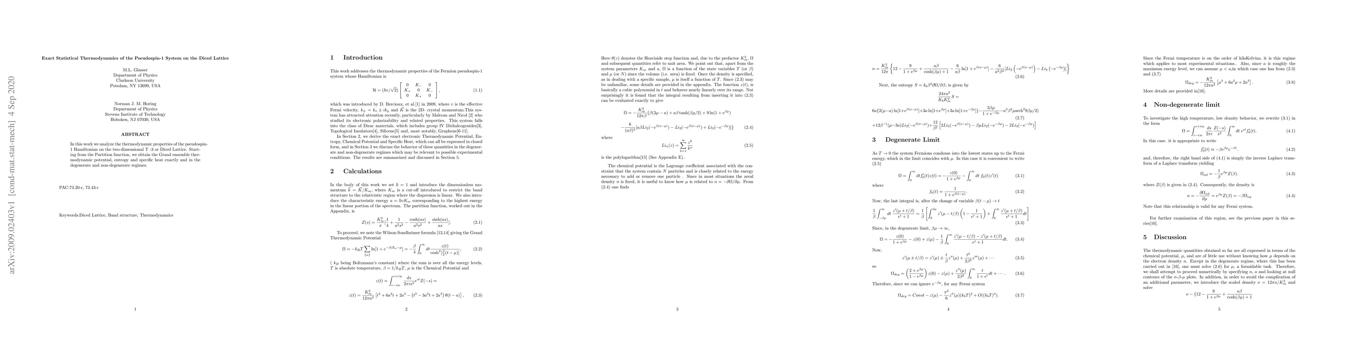 This paper provides an exact statistical thermodynamics analysis of the pseudospin-1 Hamiltonian on the Diced Lattice, deriving the Grand ensemble thermodynamic potential, entropy, and specific heat in both degenerate and non-degenerate regimes from the Partition function.