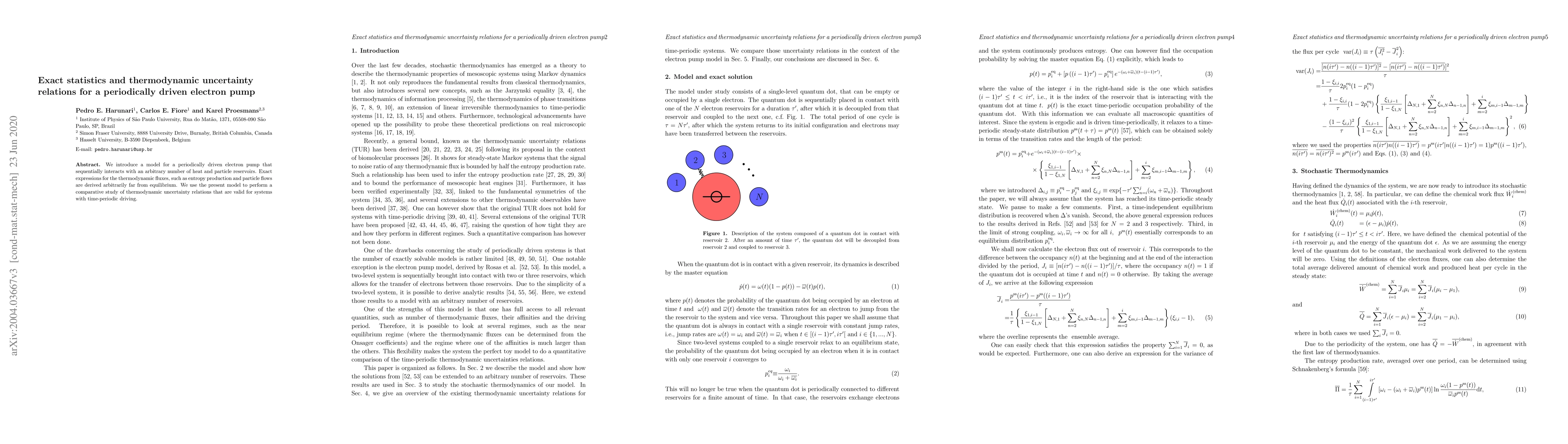 Summary: This paper models a periodically driven electron pump interacting with multiple reservoirs, deriving exact expressions for thermodynamic fluxes far from equilibrium. It also examines thermodynamic uncertainty relations applicable to time-periodically driven systems.