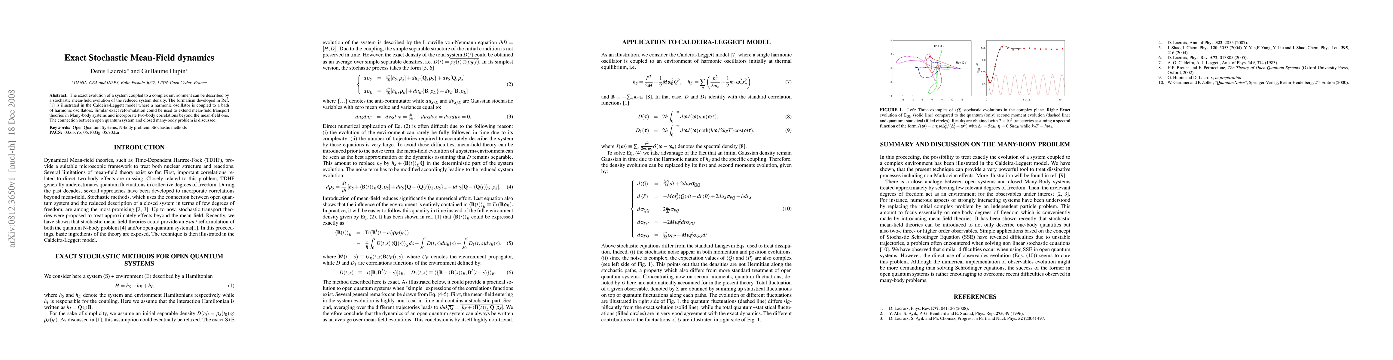 The exact evolution of a system coupled to a complex environment can be described by a stochastic mean-field evolution of the reduced system density. The formalism developed in Ref. [D.Lacroix, Phys. Rev. E77, 041126 (2008)] is illustrated in the Caldeira-Leggett model where a harmonic oscillator is coupled to a bath of harmonic oscillators. Similar exact reformulation could be used to extend mean-field transport theories in Many-body systems and incorporate two-body correlations beyond the mean-field one. The connection between open quantum system and closed many-body problem is discussed.