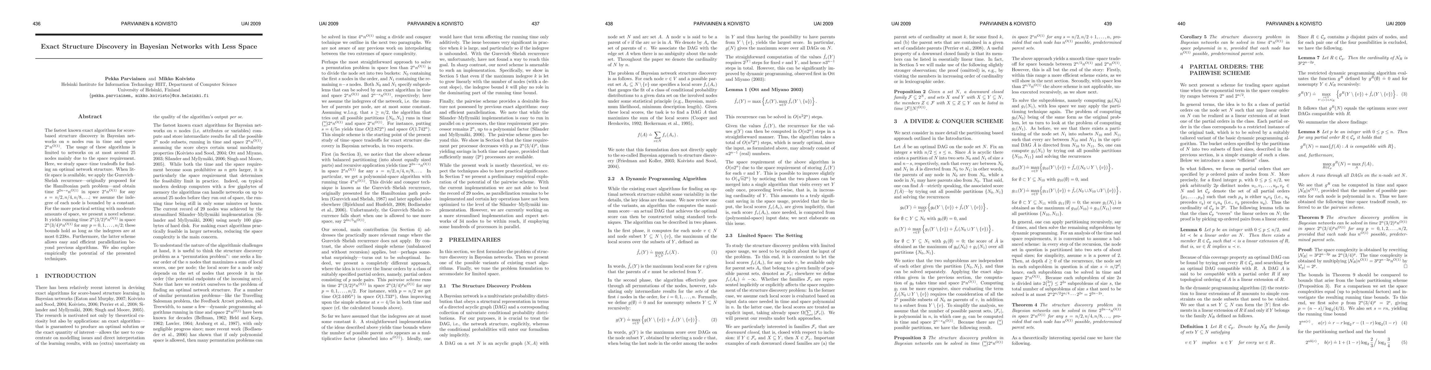 This paper proposes new algorithms for exact structure discovery in Bayesian networks with reduced space requirements, achieving significant time-space tradeoffs. It introduces a novel scheme with improved running time and space efficiency, especially under moderate space constraints, and allows for efficient parallelization.