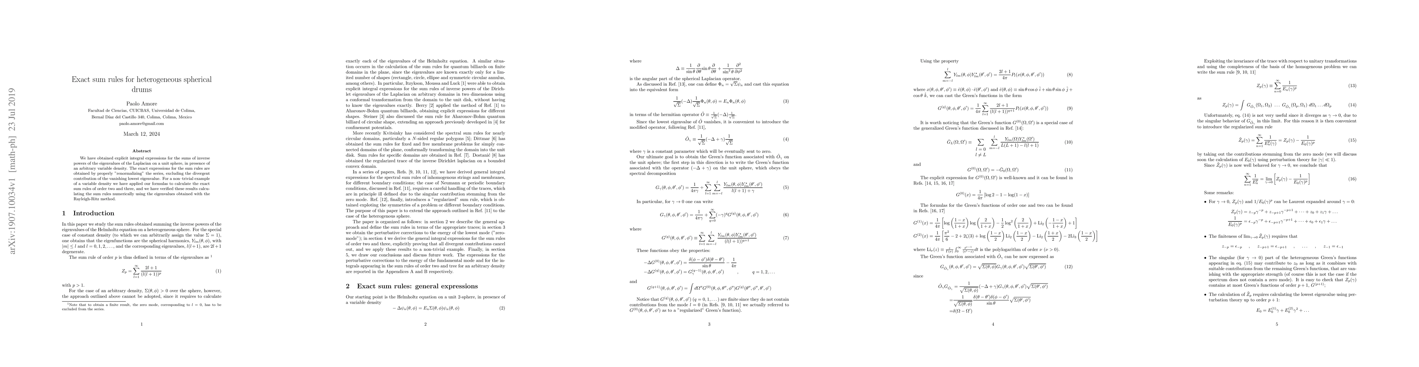 We have obtained explicit integral expressions for the sums of inverse powers of the eigenvalues of the Laplacian on a unit sphere, in presence of an arbitrary variable density. The exact expressions for the sum rules are obtained by properly "renormalizing" the series, excluding the divergent contribution of the vanishing lowest eigenvalue. For a non--trivial example of a variable density we have applied our formulas to calculate the exact sum rules of order two and three, and we have verified these results calculating the sum rules numerically using the eigenvalues obtained with the Rayleigh-Ritz method.