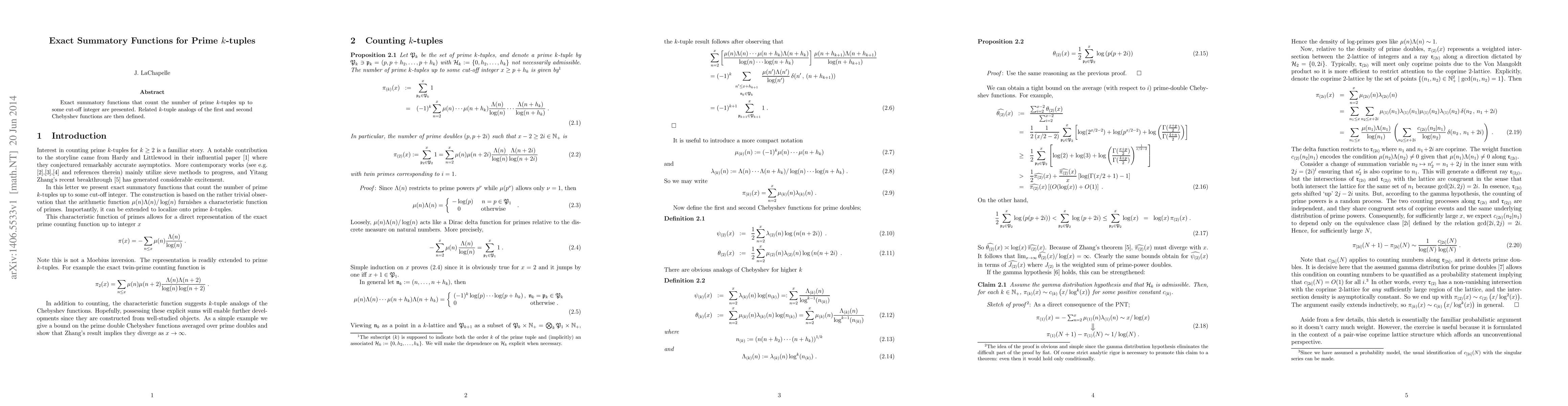 Summary: The paper introduces exact summatory functions for counting prime $k$-tuples up to a specified integer and defines $k$-tuple analogs of the first and second Chebyshev functions.