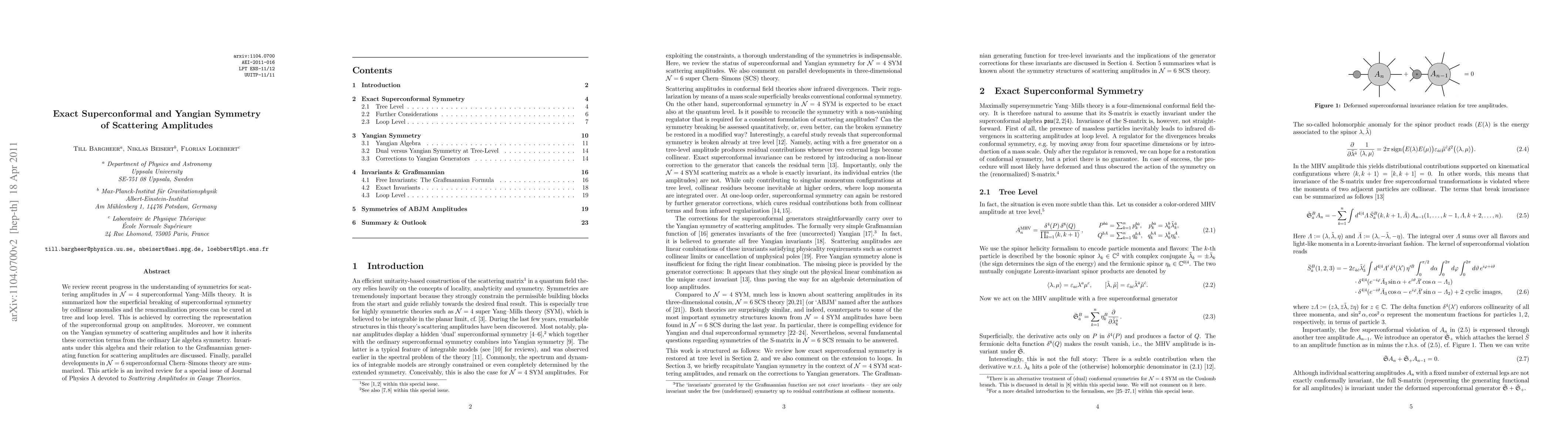 This paper reviews advancements in understanding symmetries of scattering amplitudes in N=4 superconformal Yang-Mills theory, focusing on how superconformal symmetry is preserved through corrections at tree and loop levels. It also discusses Yangian symmetry and its relation to the Lie algebra, along with its invariants and the Grassmannian generating function, and parallels in N=6 superconformal Chern-Simons theory.