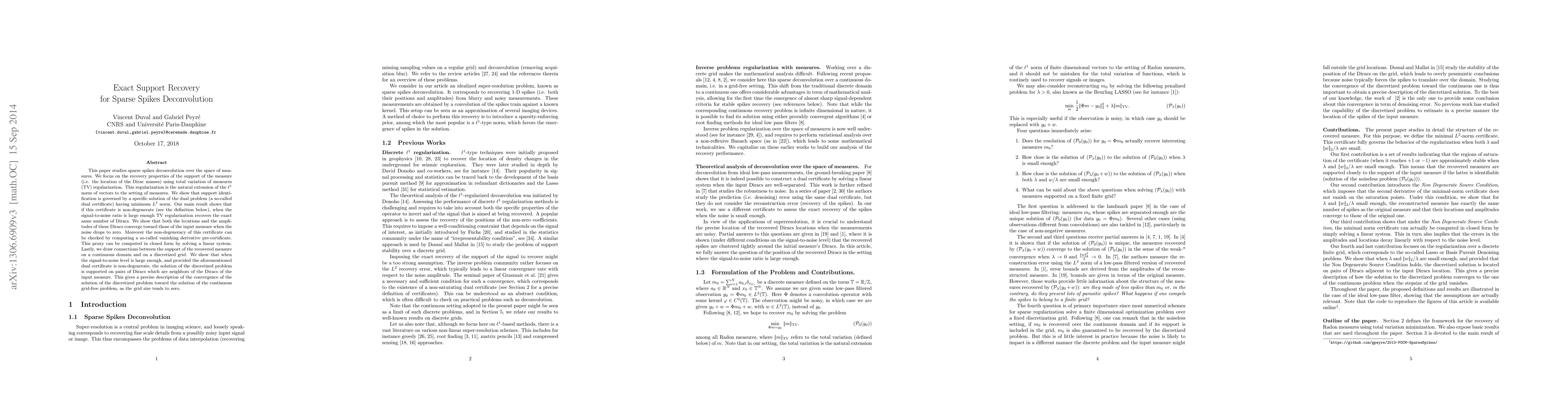 Researchers developed a method to recover exact support of a measure (a mathematical concept representing probability distributions) from noisy data, showing that large signal-to-noise ratio enables recovery with minimal error; the solution converges to the original input as noise decreases.