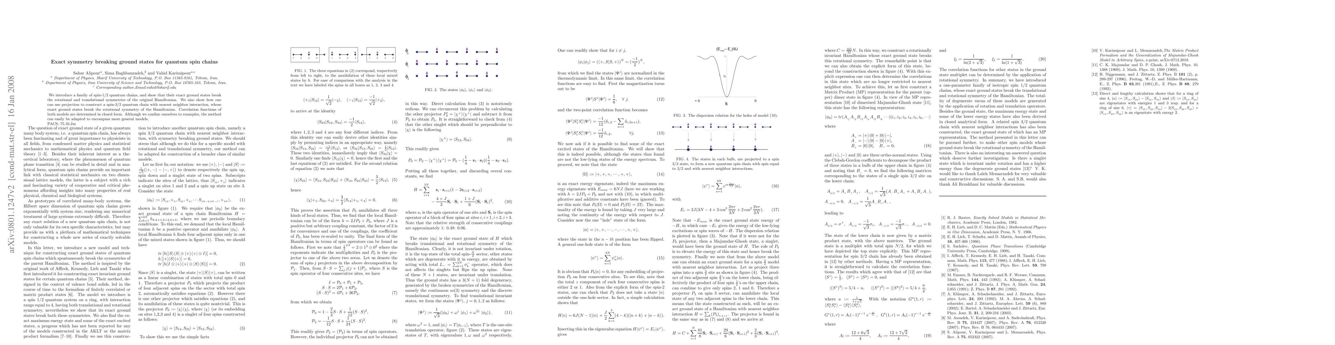 This paper introduces spin-1/2 quantum chains whose exact ground states break rotational and translational symmetries, and constructs a spin-3/2 chain with broken rotational symmetry via projection. The correlation functions for both models are determined in closed form.