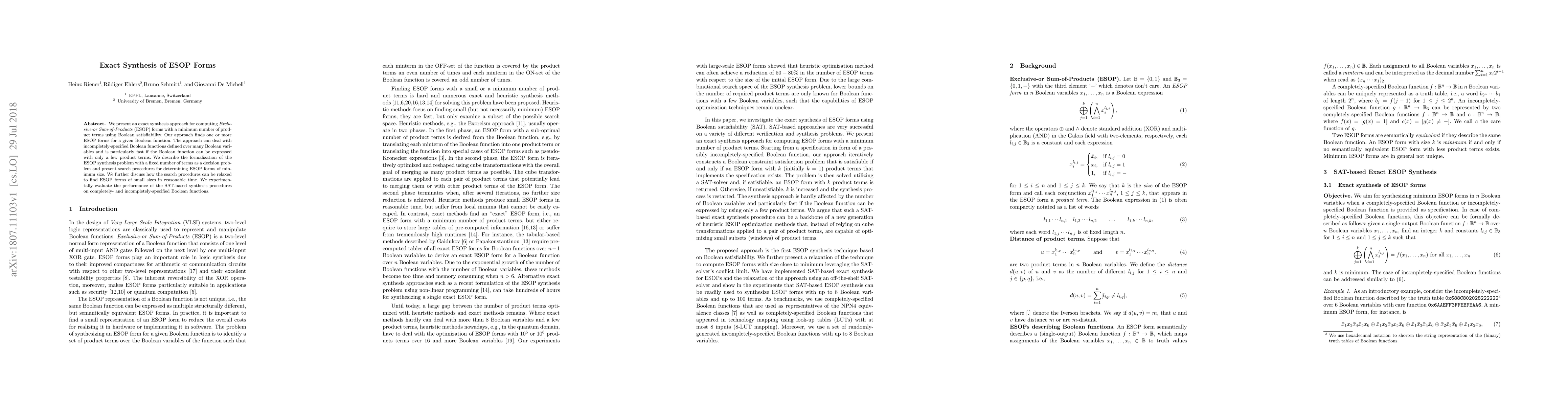 We present an exact synthesis approach for computing Exclusive-or Sum-of-Products (ESOP) forms with a minimum number of product terms using Boolean satisfiability. Our approach finds one or more ESOP forms for a given Boolean function. The approach can deal with incompletely-specified Boolean functions defined over many Boolean variables and is particularly fast if the Boolean function can be expressed with only a few product terms. We describe the formalization of the ESOP synthesis problem with a fixed number of terms as a decision problem and present search procedures for determining ESOP forms of minimum size. We further discuss how the search procedures can be relaxed to find ESOP forms of small sizes in reasonable time. We experimentally evaluate the performance of the SAT-based synthesis procedures on completely- and incompletely-specified Boolean functions.
