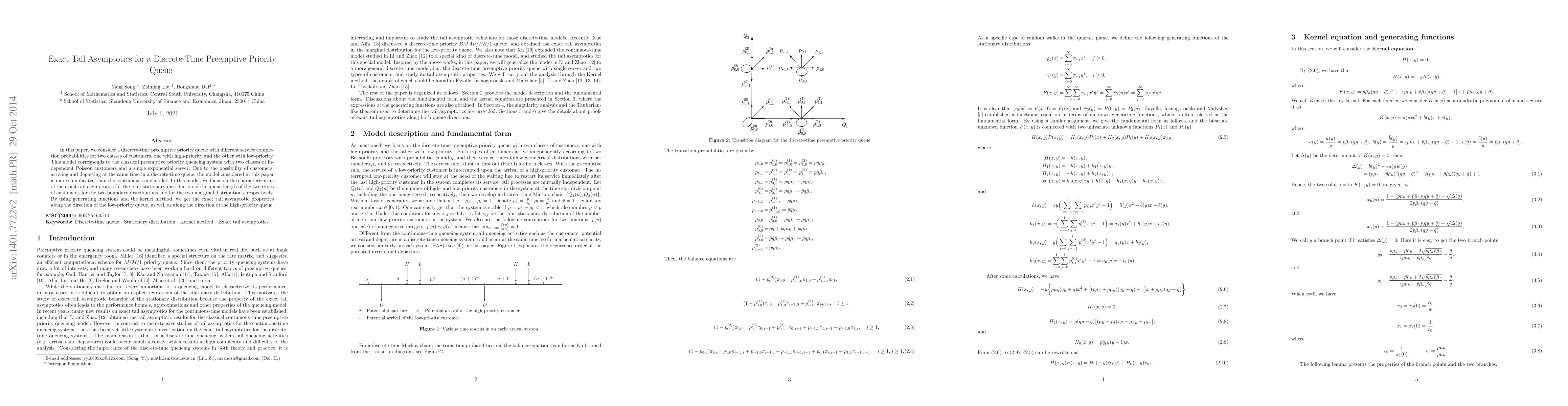 This paper investigates exact tail asymptotics for a discrete-time preemptive priority queue with two customer classes, high-priority and low-priority, and different service rates. It derives explicit expressions for the tail asymptotics of the joint stationary distribution using generating functions and the kernel method.