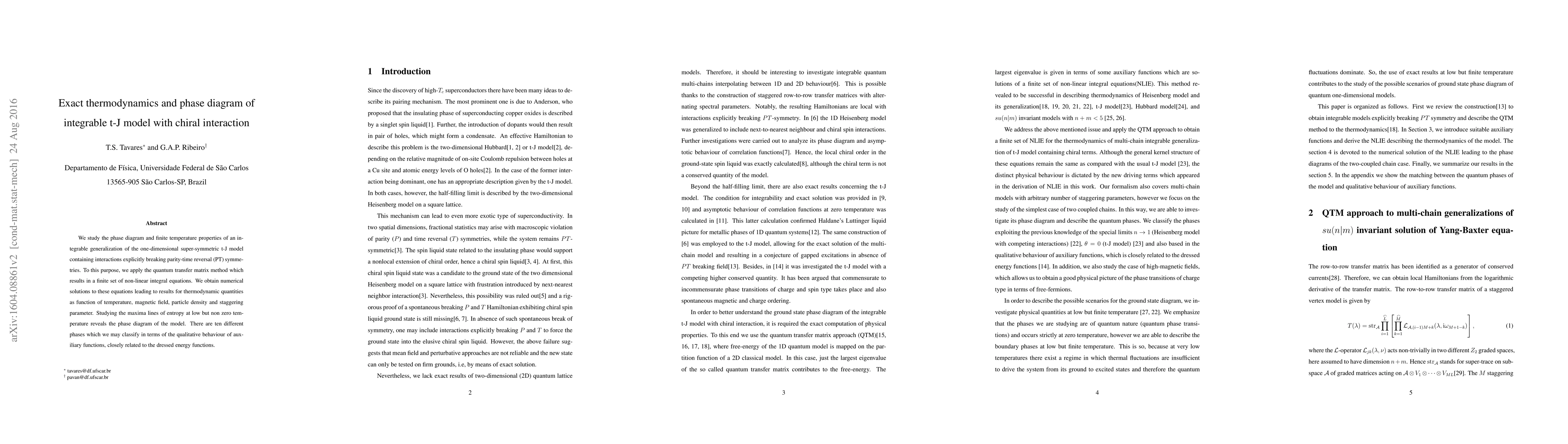 We study the phase diagram and finite temperature properties of an integrable generalization of the one-dimensional super-symmetric t-J model containing interactions explicitly breaking parity-time reversal (PT) symmetries. To this purpose, we apply the quantum transfer matrix method which results in a finite set of non-linear integral equations. We obtain numerical solutions to these equations leading to results for thermodynamic quantities as function of temperature, magnetic field, particle density and staggering parameter. Studying the maxima lines of entropy at low but non zero temperature reveals the phase diagram of the model. There are ten different phases which we may classify in terms of the qualitative behaviour of auxiliary functions, closely related to the dressed energy functions.
