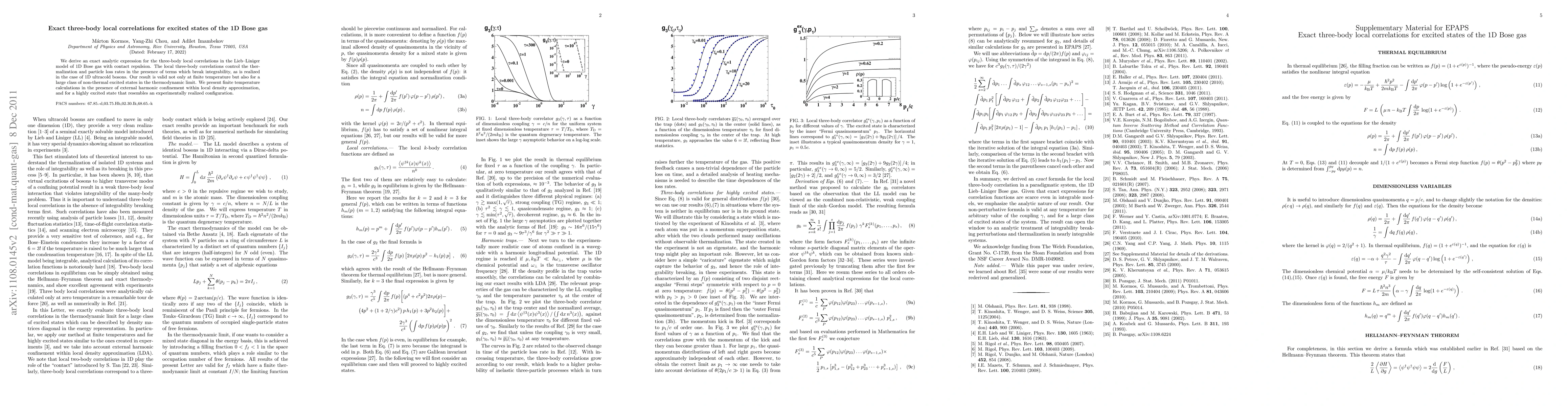 This paper derives an exact analytic expression for three-body local correlations in the 1D Bose gas, crucial for understanding thermalization and particle loss rates in non-integrable systems. The findings are valid for both finite temperatures and a wide range of non-thermal excited states.