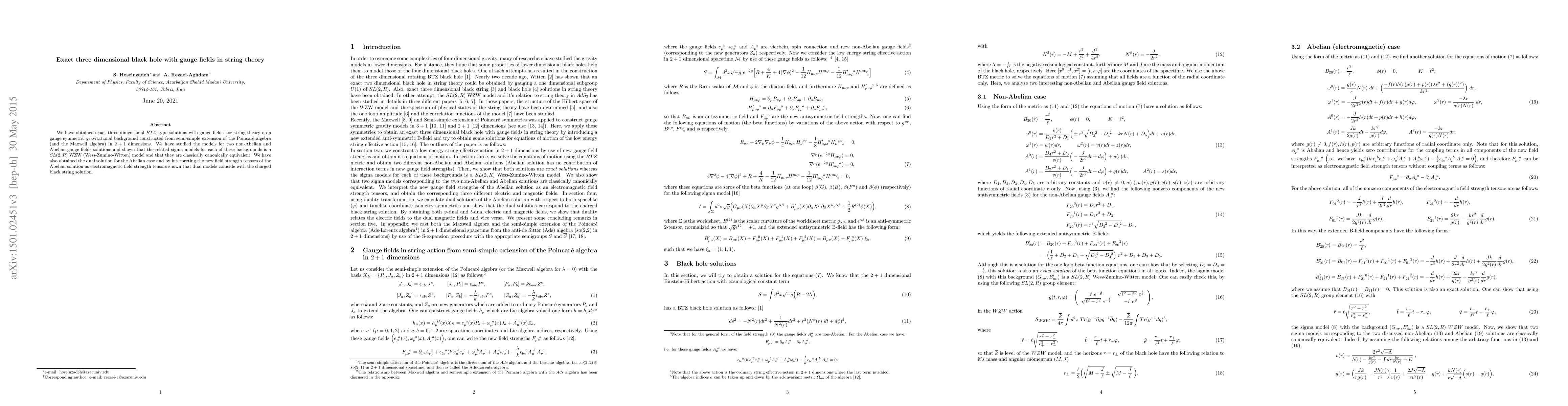 This paper presents exact three-dimensional BTZ solutions with gauge fields in string theory, demonstrating equivalence between non-Abelian and Abelian gauge field models via SL(2;R) WZW models. It also finds dual solutions for the Abelian case, showing they correspond to charged black string solutions.