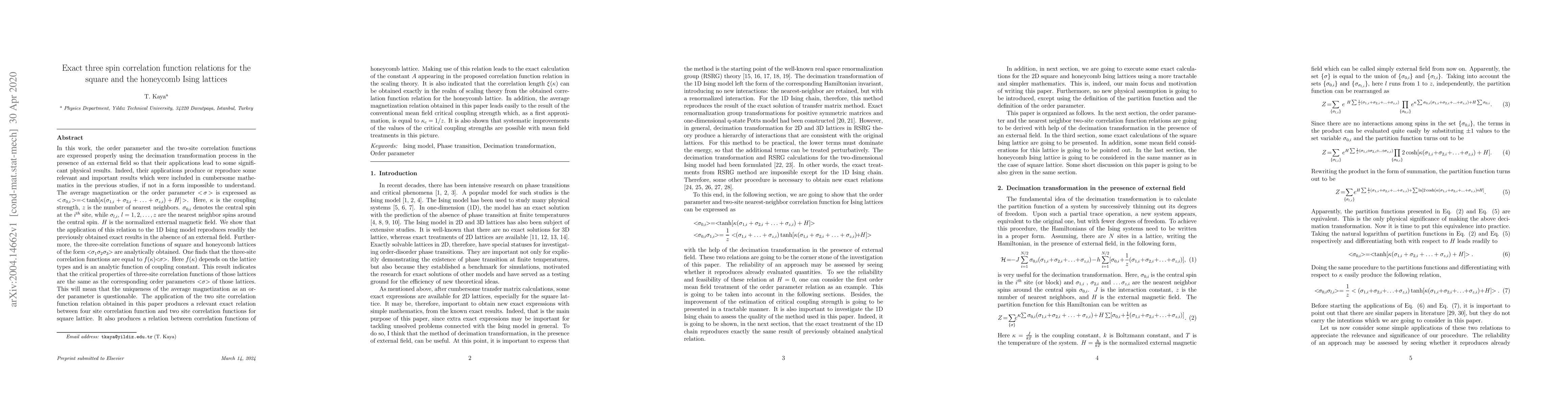 In this work, the order parameter and the two-site correlation functions are expressed properly using the decimation transformation process in the presence of an external field so that their applications lead to some significant physical results. Indeed, their applications produce or reproduce some relevant and important results which were included in cumbersome mathematics in the previous studies, if not in a form impossible to understand. The average magnetization or the order parameter $<\!\!\sigma\!\!> $ is expressed as $<\!\!\sigma_{0,i}\!\!>= <\!\!\tanh[ \kappa(\sigma_{1,i}+\sigma_{2,i}+\dots +\sigma_{z,i})+H]\!\!> $. Here, $\kappa$ is the coupling strength, $z$ is the number of nearest neighbors. $\sigma_{0,i}$ denotes the central spin at the $i^{th}$ site, while $\sigma_{l,i}$, $l=1,2,\dots,z$ are the nearest neighbor spins around the central spin. $H$ is the normalized external magnetic field. We show that the application of this relation to the 1D Ising model reproduces readily the previously obtained exact results in the absence of an external field. Furthermore, the three-site correlation functions of square and honeycomb lattices of the form $<\!\!\sigma_{1}\sigma_{2}\sigma_{3}\!\!>$ are analytically obtained. One finds that the three-site correlation functions are equal to $f(\kappa)\!\!<\!\!\sigma\!\!>$. Here $f(\kappa)$ depends on the lattice types and is an analytic function of coupling constant. This result indicates that the critical properties of three-site correlation functions of those lattices are the same as the corresponding order parameters $<\!\!\sigma\!\!>$ of those lattices. This will mean that the uniqueness of the average magnetization as an order parameter is questionable. ...