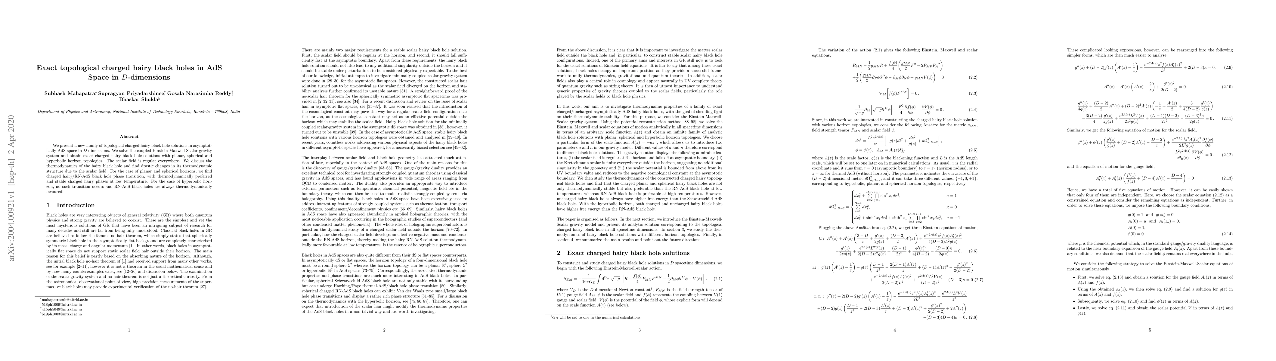 This paper presents exact solutions for topological charged hairy black holes in $D$-dimensional asymptotically AdS space, solving the Einstein-Maxwell-Scalar system. It finds drastic thermodynamic changes due to the scalar field, with phase transitions occurring for planar and spherical horizons but not for hyperbolic ones.