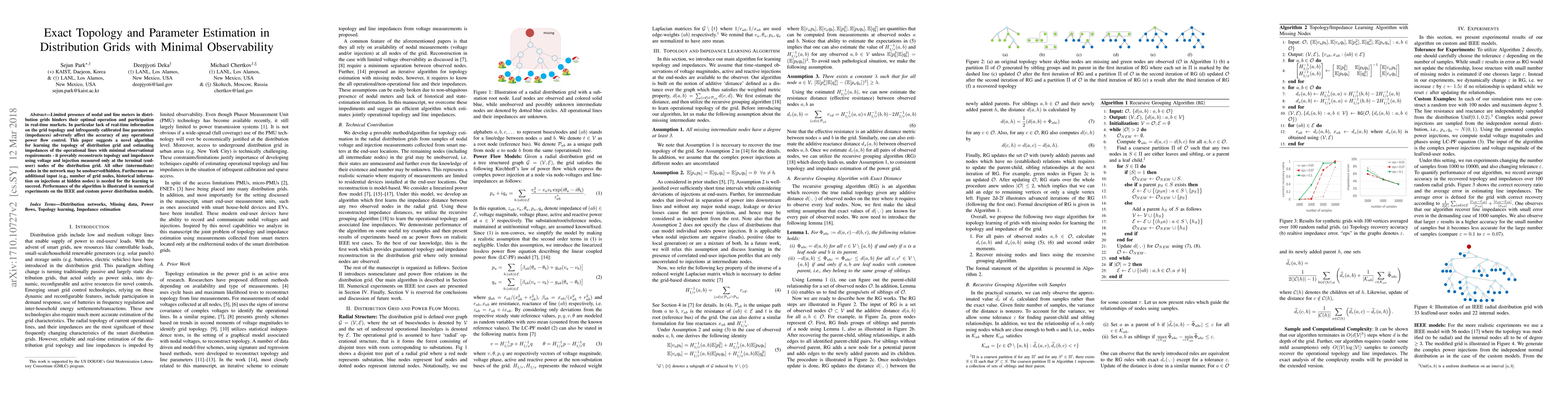 Limited presence of nodal and line meters in distribution grids hinders their optimal operation and participation in real-time markets. In particular lack of real-time information on the grid topology and infrequently calibrated line parameters (impedances) adversely affect the accuracy of any operational power flow control. This paper suggests a novel algorithm for learning the topology of distribution grid and estimating impedances of the operational lines with minimal observational requirements - it provably reconstructs topology and impedances using voltage and injection measured only at the terminal (end-user) nodes of the distribution grid. All other (intermediate) nodes in the network may be unobserved/hidden. Furthermore no additional input (e.g., number of grid nodes, historical information on injections at hidden nodes) is needed for the learning to succeed. Performance of the algorithm is illustrated in numerical experiments on the IEEE and custom power distribution models.