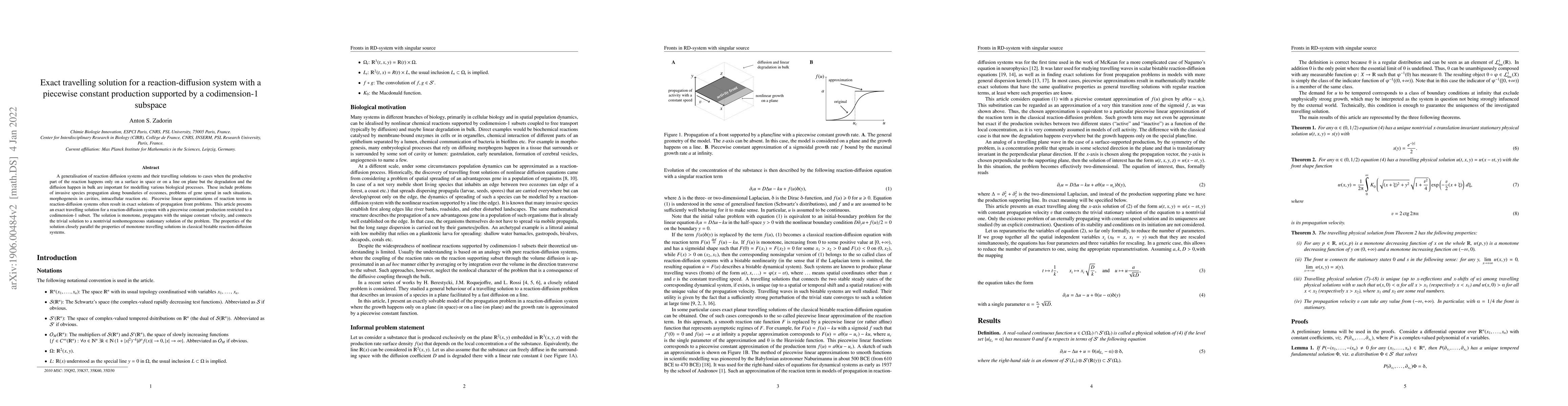 A generalisation of reaction diffusion systems and their travelling solutions to cases when the productive part of the reaction happens only on a surface in space or on a line on plane but the degradation and the diffusion happen in bulk are important for modelling various biological processes. These include problems of invasive species propagation along boundaries of ecozones, problems of gene spread in such situations, morphogenesis in cavities, intracellular reaction etc. Piecewise linear approximations of reaction terms in reaction-diffusion systems often result in exact solutions of propagation front problems. This article presents an exact travelling solution for a reaction-diffusion system with a piecewise constant production restricted to a codimension-1 subset. The solution is monotone, propagates with the unique constant velocity, and connects the trivial solution to a nontrivial nonhomogeneous stationary solution of the problem. The properties of the solution closely parallel the properties of monotone travelling solutions in classical bistable reaction-diffusion systems.