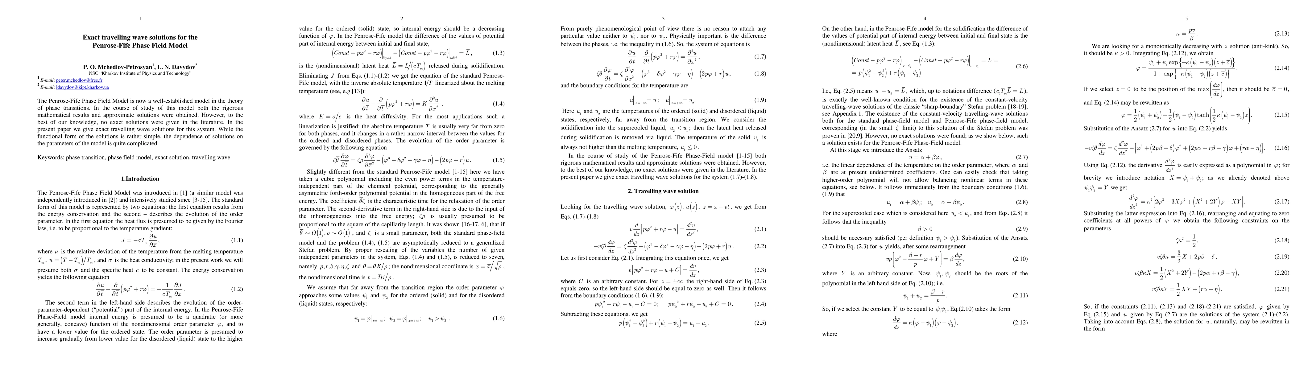 This paper provides exact traveling wave solutions for the Penrose-Fife Phase Field Model, a well-established model in phase transitions theory, offering new insights into the system's behavior and dependence on parameters.