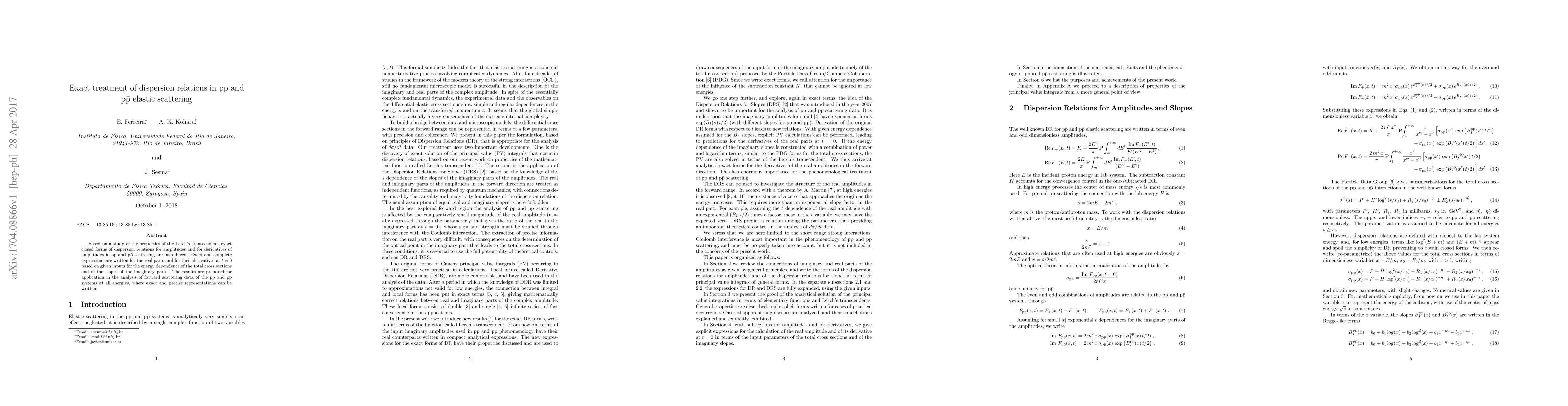 Based on a study of the properties of the Lerch's transcendent, exact closed forms of dispersion relations for amplitudes and for derivatives of amplitudes in pp and p\=p scattering are introduced. Exact and complete expressions are written for the real parts and for their derivatives at $t=0$ based on given inputs for the energy dependence of the total cross sections and of the slopes of the imaginary parts. The results are prepared for application in the analysis of forward scattering data of the pp and p\=p systems at all energies, where exact and precise representations can be written.