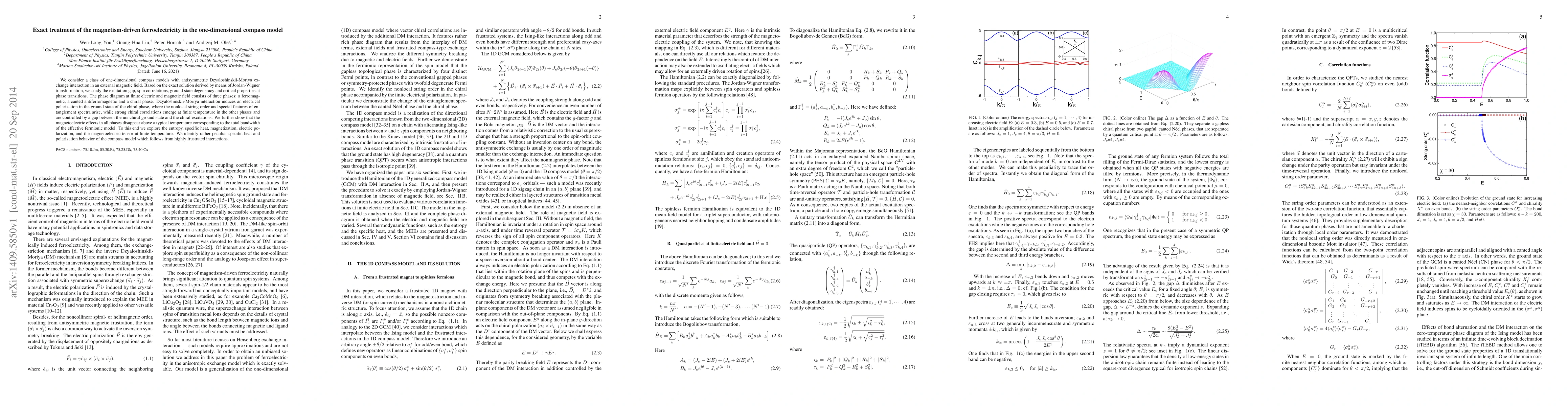 We consider a class of one-dimensional compass models with antisymmetric Dzyaloshinskii-Moriya exchange interaction in an external magnetic field. Based on the exact solution derived by means of Jordan-Wigner transformation, we study the excitation gap, spin correlations, ground-state degeneracy, and critical properties at phase transitions. The phase diagram at finite electric and magnetic field consists of three phases: ferromagnetic, canted antiferromagnetic, and chiral. Dzyaloshinskii-Moriya interaction induces an electrical polarization in the ground state of the chiral phase, where the nonlocal string order and special features of entanglement spectra arise, while strong chiral correlations emerge at finite temperature in the other phases and are controlled by a gap between the nonchiral ground state and the chiral excitations. We further show that the magnetoelectric effects in all phases disappear above a typical temperature corresponding to the total bandwidth of the effective fermionic model. To this end we explore the entropy, specific heat, magnetization, electric polarization, and the magnetoelectric tensor at finite temperature. We identify rather peculiar specific-heat and polarization behavior of the compass model which follows from highly frustrated interactions.