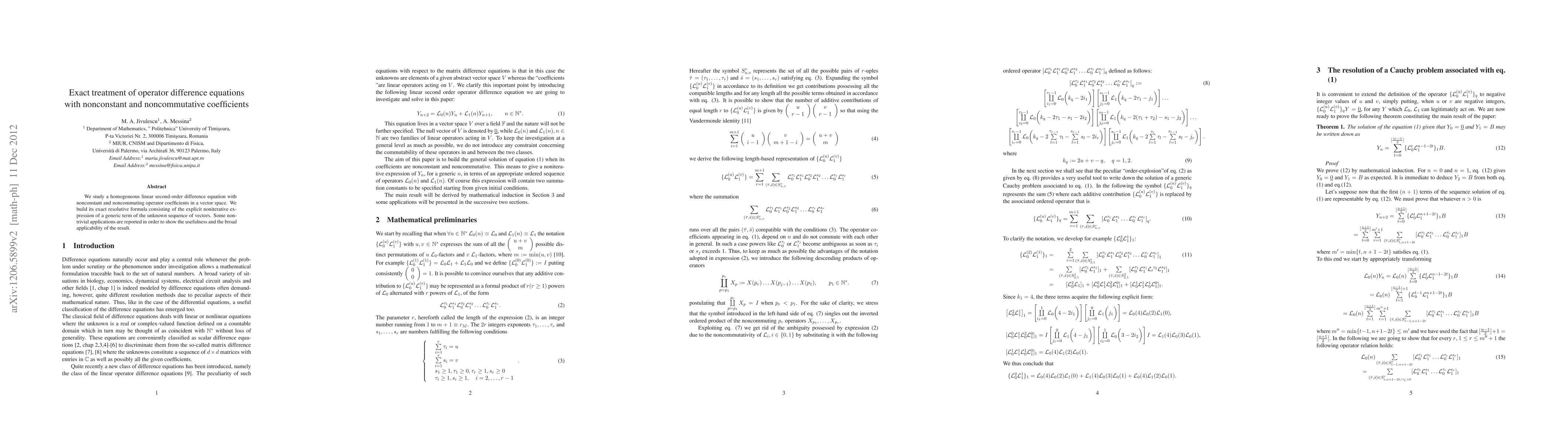 In this paper we study in a Hilbert space a homogeneous linear second order difference equation with nonconstant and noncommuting operator coefficients. We build its exact resolutive formula consisting in the explicit non-iterative expression of a generic term of the unknown sequence of vectors of the Hilbert space. Some non-trivial applications are reported with the aim of showing the usefulness and the broad applicability of our result.