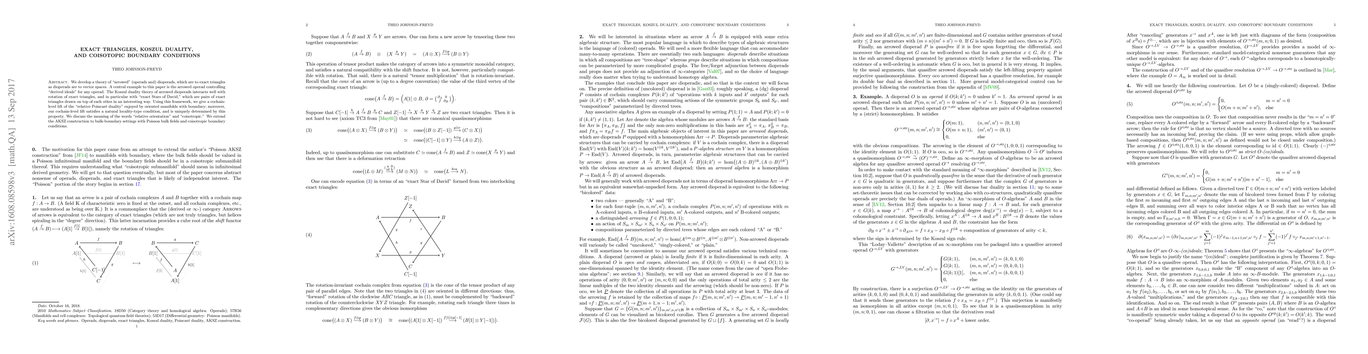 We develop a theory of "arrowed" (operads and) dioperads, which are to exact triangles as dioperads are to vector spaces. A central example to this paper is the arrowed operad controlling "derived ideals" for any operad. The Koszul duality theory of arrowed dioperads interacts well with rotation of exact triangles, and in particular with "exact Stars of David," which are pairs of exact triangles drawn on top of each other in an interesting way. Using this framework, we give a cochain-level lift of the "relative Poincar\'e duality" enjoyed by oriented manifolds with boundary; moreover, our cochain-level lift satisfies a natural locality-type condition, and is uniquely determined by this property. We discuss the meaning of the words "relative orientation" and "coisotropic." We extend the AKSZ construction to bulk-boundary settings with Poisson bulk fields and coisotropic boundary conditions.