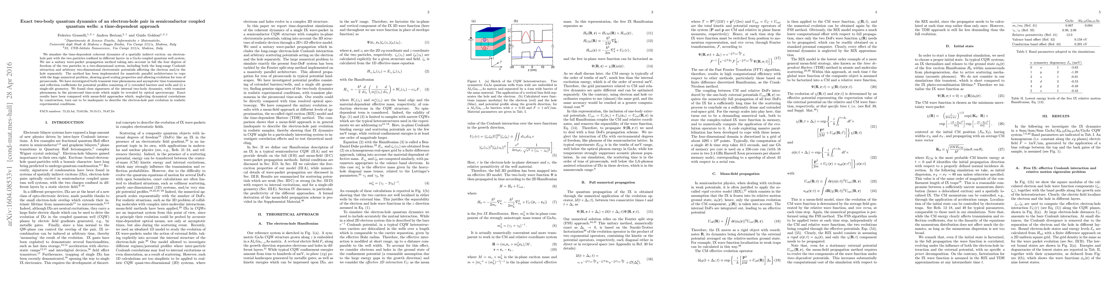 We simulate the time-dependent coherent dynamics of a spatially indirect exciton (an electron-hole pair with the two particles confined in different layers) in a GaAs coupled quantum well system. We use a unitary wave-packet propagation method taking into account in full the four degrees of freedom of the two particles in a two-dimensional system, including both the long-range Coulomb attraction and arbitrary two-dimensional electrostatic potentials affecting the electron and/or the hole separately. The method has been implemented for massively parallel architectures to cope with the huge numerical problem, showing good scaling properties and allowing evolution for tens of picoseconds. We have investigated both transient time phenomena and asymptotic time transmission and reflection coefficients for potential profiles consisting of i) extended barriers and wells and ii) a single-slit geometry. We found clear signatures of the internal two-body dynamics, with transient phenomena in the picosecond time-scale which might be revealed by optical spectroscopy. Exact results have been compared with mean-field approaches which, neglecting dynamical correlations by construction, turn out to be inadequate to describe the electron-hole pair evolution in realistic experimental conditions.