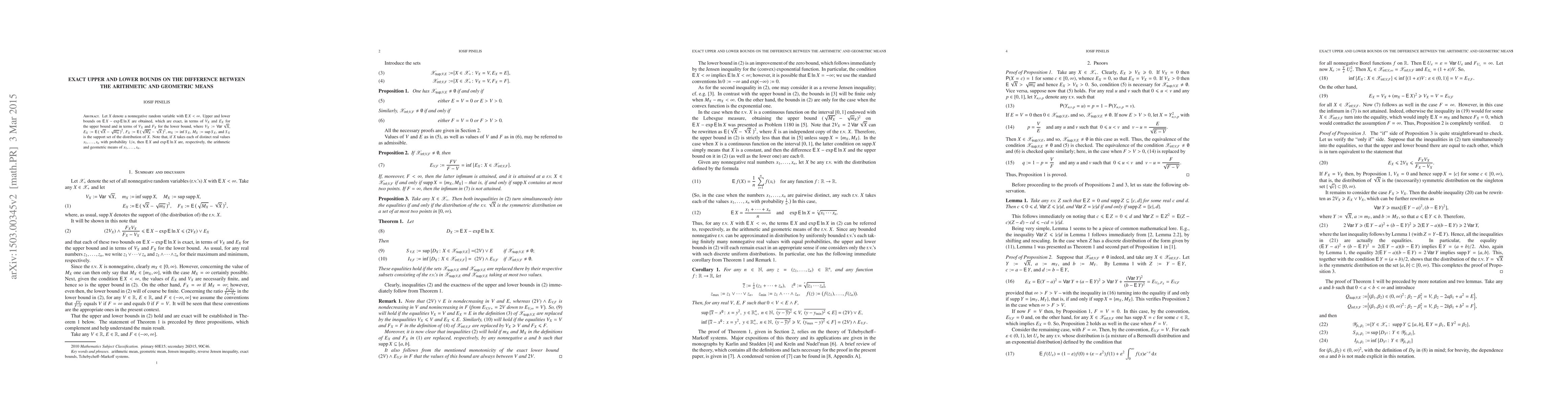 Let $X$ denote a nonnegative random variable with $\mathsf{E} X<\infty$. Upper and lower bounds on $\mathsf{E} X-\exp\mathsf{E}\ln X$ are obtained, which are exact, in terms of $V_X$ and $E_X$ for the upper bound and in terms of $V_X$ and $F_X$ for the lower bound, where $V_X:=\mathsf{Var}\sqrt X$, $E_X:=\mathsf{E}\big(\sqrt X-\sqrt{m_X}\,\big)^2$, $F_X:=\mathsf{E}\big(\sqrt{M_X}-\sqrt X\,\big)^2$, $m_X:=\inf S_X$, $M_X:=\sup S_X$, and $S_X$ is the support set of the distribution of $X$. Note that, if $X$ takes each of distinct real values $x_1,\dots,x_n$ with probability $1/n$, then $\mathsf{E} X$ and $\exp\mathsf{E}\ln X$ are, respectively, the arithmetic and geometric means of $x_1,\dots,x_n$.