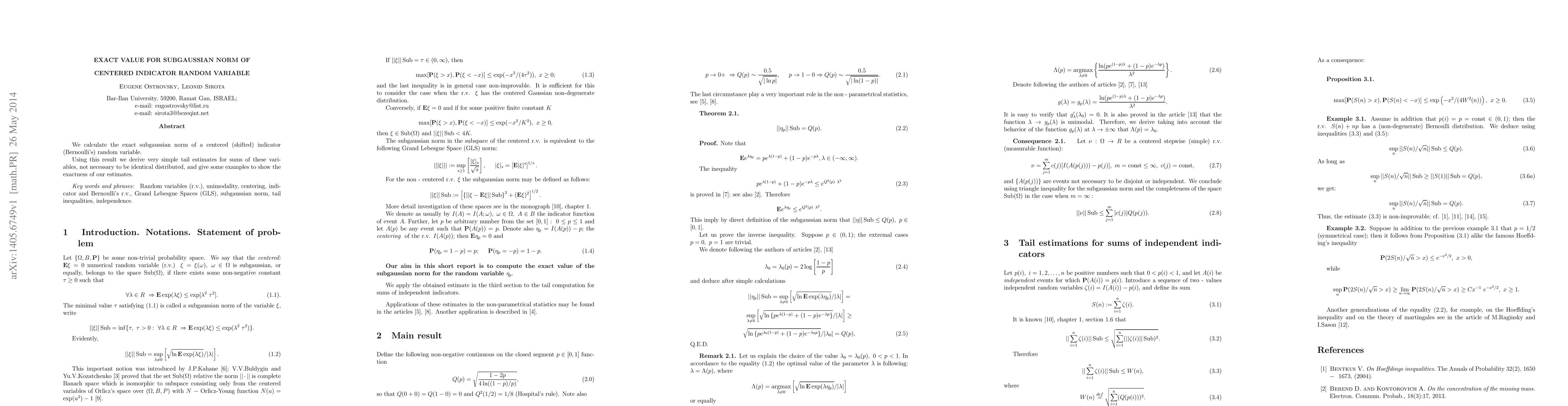 We calculate the exact subgaussian norm of a centered (shifted) indicator (Bernoulli's) random variable. Using this result we derive very simple tail estimates for sums of these variables, not necessary to be identical distributed, and give some examples to show the exactness of our estimates.