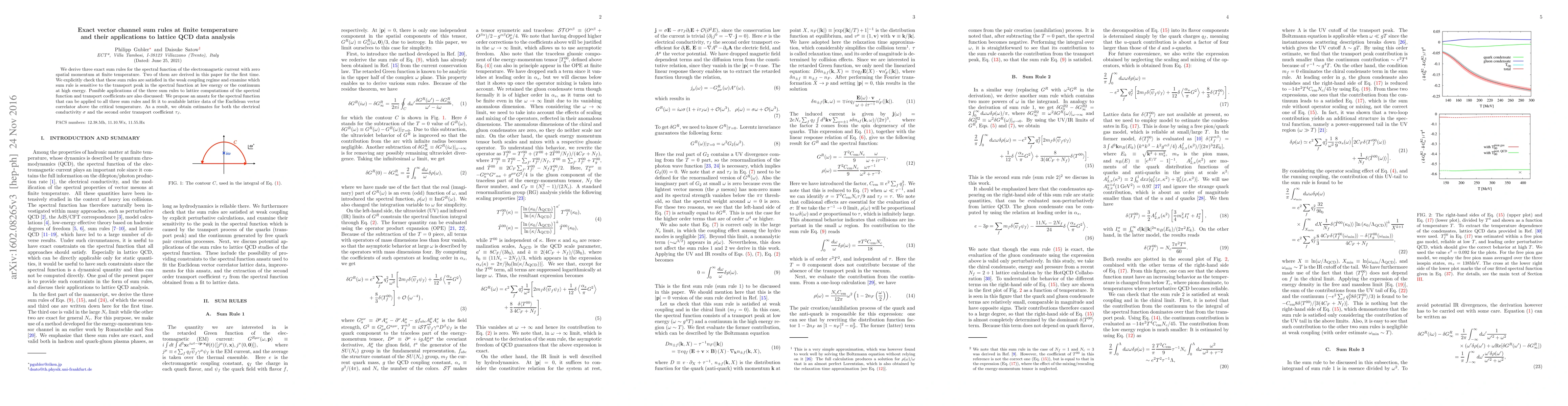 This paper derives three exact sum rules for the spectral function of the electromagnetic current at finite temperature, two of which are newly established. The authors test these rules in the weak coupling regime and analyze their sensitivity to transport phenomena. They propose an ansatz for the spectral function and fit it to lattice QCD data to estimate electrical conductivity and a second-order transport coefficient.