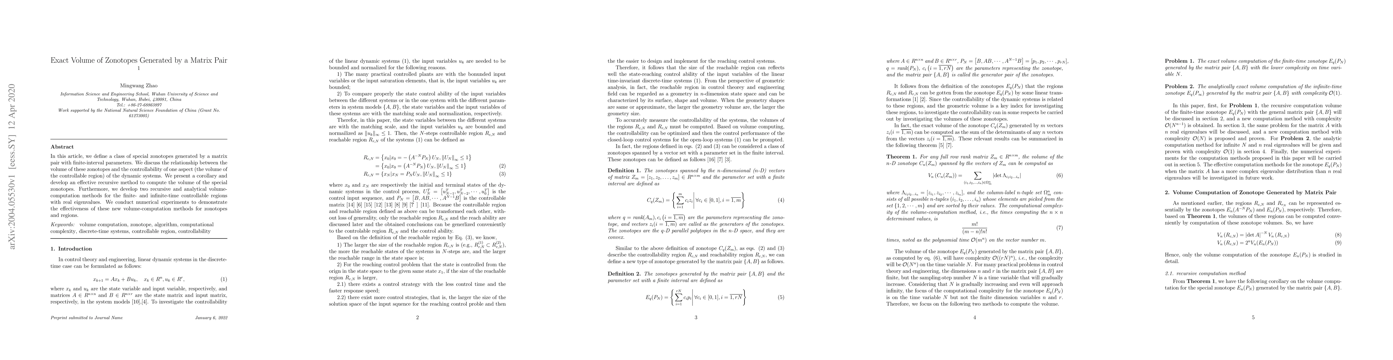 This paper defines a class of zonotopes generated by matrix pairs and explores their volume in relation to dynamic system controllability. It presents recursive methods for computing the volume of these zonotopes and demonstrates their effectiveness through numerical experiments.