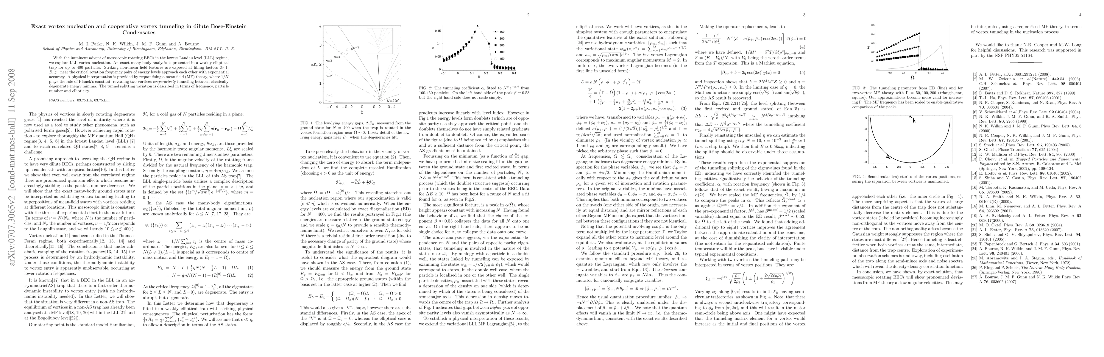This research presents an exact analysis of vortex nucleation in dilute BECs under weak elliptical traps, revealing non-mean field phenomena at high filling factors. It introduces a requantized mean field theory, interpreting cooperative vortex tunneling between degenerate energy minima, with tunnel splitting varying based on rotation frequency, particle number, and ellipticity.