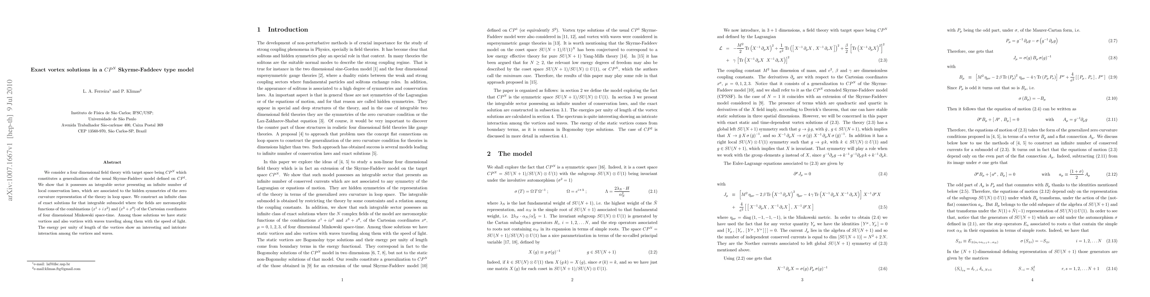 We consider a four dimensional field theory with target space being CP^N which constitutes a generalization of the usual Skyrme-Faddeev model defined on CP^1. We show that it possesses an integrable sector presenting an infinite number of local conservation laws, which are associated to the hidden symmetries of the zero curvature representation of the theory in loop space. We construct an infinite class of exact solutions for that integrable submodel where the fields are meromorphic functions of the combinations (x^1+i x^2) and (x^3+x^0) of the Cartesian coordinates of four dimensional Minkowski space-time. Among those solutions we have static vortices and also vortices with waves traveling along them with the speed of light. The energy per unity of length of the vortices show an interesting and intricate interaction among the vortices and waves.