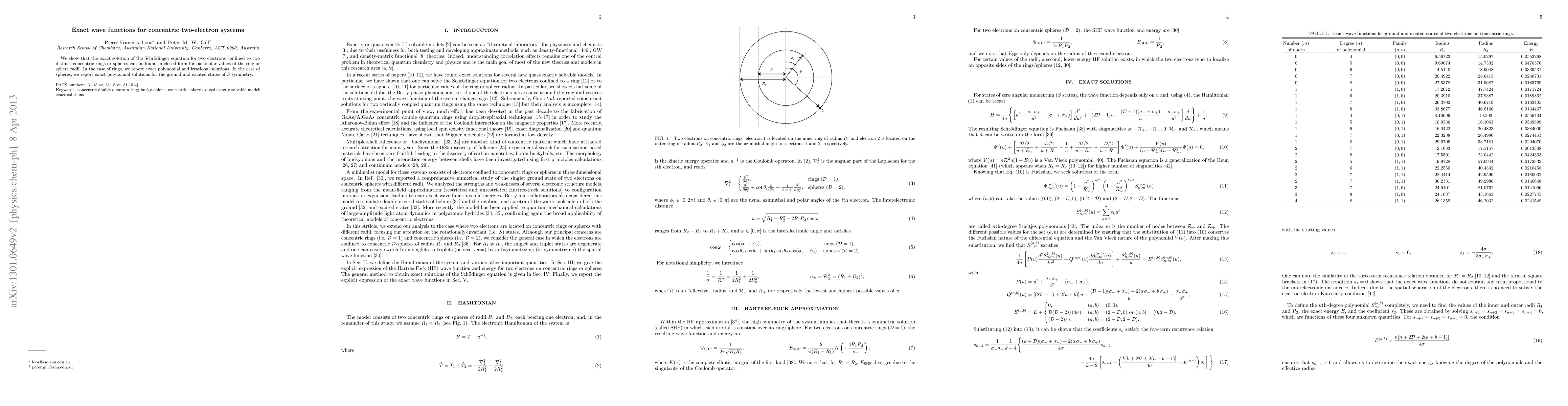Researchers have found exact wave functions for two-electron systems confined to concentric rings and spheres, revealing polynomial solutions in certain cases and no terms proportional to the interelectronic distance.