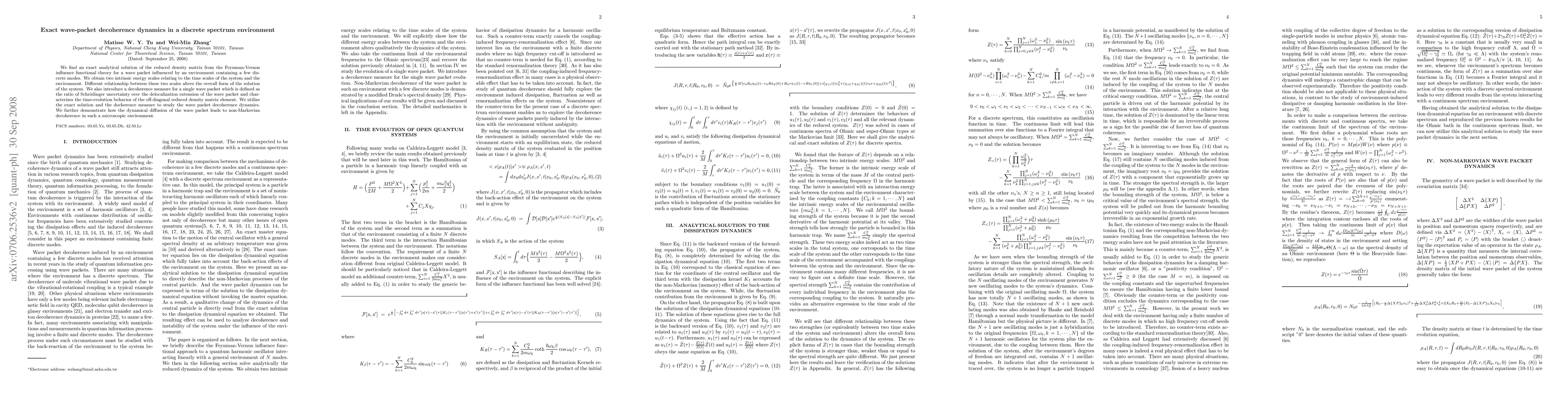 This paper presents an exact analytical solution for the reduced density matrix of a wave packet in a discrete spectrum environment, revealing two intrinsic energy scales. It introduces a decoherence measure and uses it to study the non-Markovian decoherence dynamics influenced by the dynamical diffusion of the wave packet.