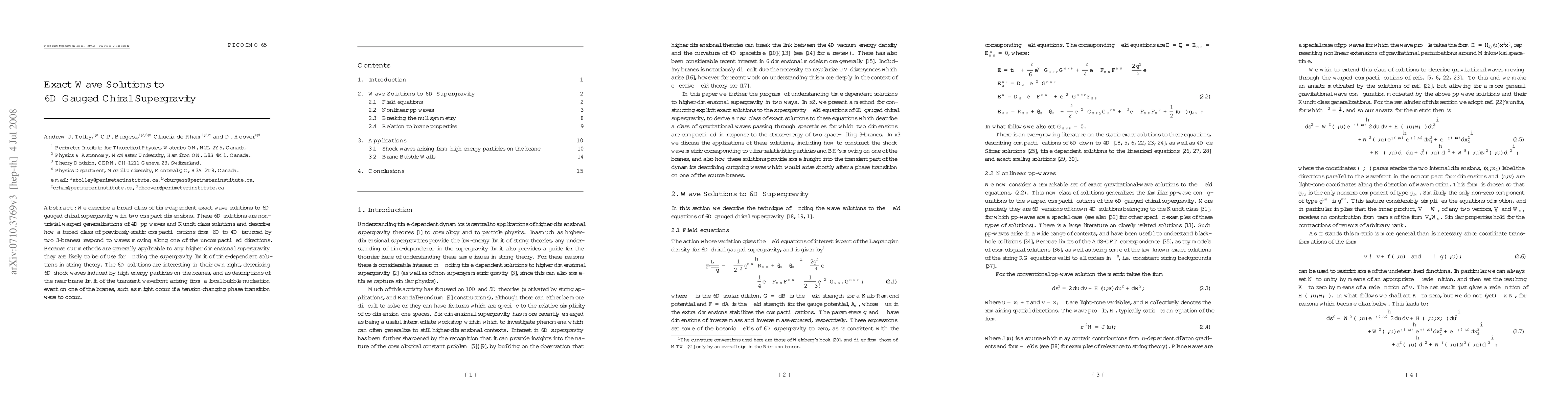 We describe a broad class of time-dependent exact wave solutions to 6D gauged chiral supergravity with two compact dimensions. These 6D solutions are nontrivial warped generalizations of 4D pp-waves and Kundt class solutions and describe how a broad class of previously-static compactifications from 6D to 4D (sourced by two 3-branes) respond to waves moving along one of the uncompactified directions. Because our methods are generally applicable to any higher dimensional supergravity they are likely to be of use for finding the supergravity limit of time-dependent solutions in string theory. The 6D solutions are interesting in their own right, describing 6D shock waves induced by high energy particles on the branes, and as descriptions of the near-brane limit of the transient wavefront arising from a local bubble-nucleation event on one of the branes, such as might occur if a tension-changing phase transition were to occur.